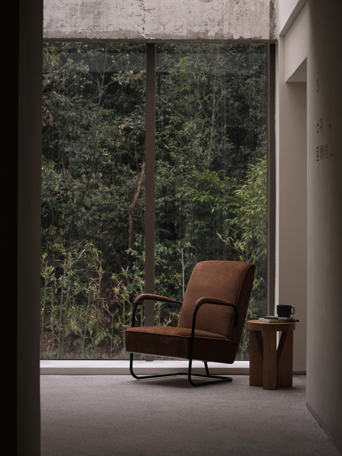 室内-行为引导空间在这个面积两千平米,却承载了多种功能的场所中,如果将进入建筑的人群按目的分类,可能会有:办公、就餐、参观、集会、烹饪、工作坊、长租、短住等若干种。通过空间划分和动线归置也许可以让几股人流尽量互不打扰,但却一定程度上破坏了这个随机社群的共有性,违背了“真实的空间”的设计初衷。我们将人群按照对私密性的要求等级进行了排列,除等级最高的主楼二、三层23间客房外,各公共空间都相应给予了一定的自由度。如主楼一层,既有刷卡进入的共享办公区,也有对外开放的展厅阅览区,但两个空间视线上却是联通的,仅以绿植做阻隔。而整个共享办公区,除两间会议室之外,皆为开敞的连续空间,只通过地面的抬高与下沉划分场地,且对每个区域的具体功能不做约束,使用者甚至可以自行改变格局。在这样自由的公共环境中,当然也需要一定的私密性,设计通过在几条动线中添加半围合区域,来实现一些“驿站”式的独处空间。值得一提的是,为了确保这样的自由空间不会为使用带来困扰,间筑也包揽了项目中所有的标识与导视设计。