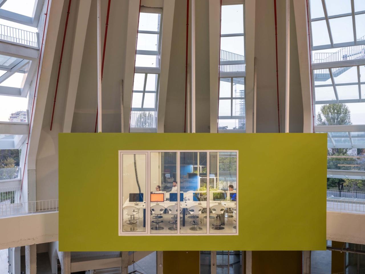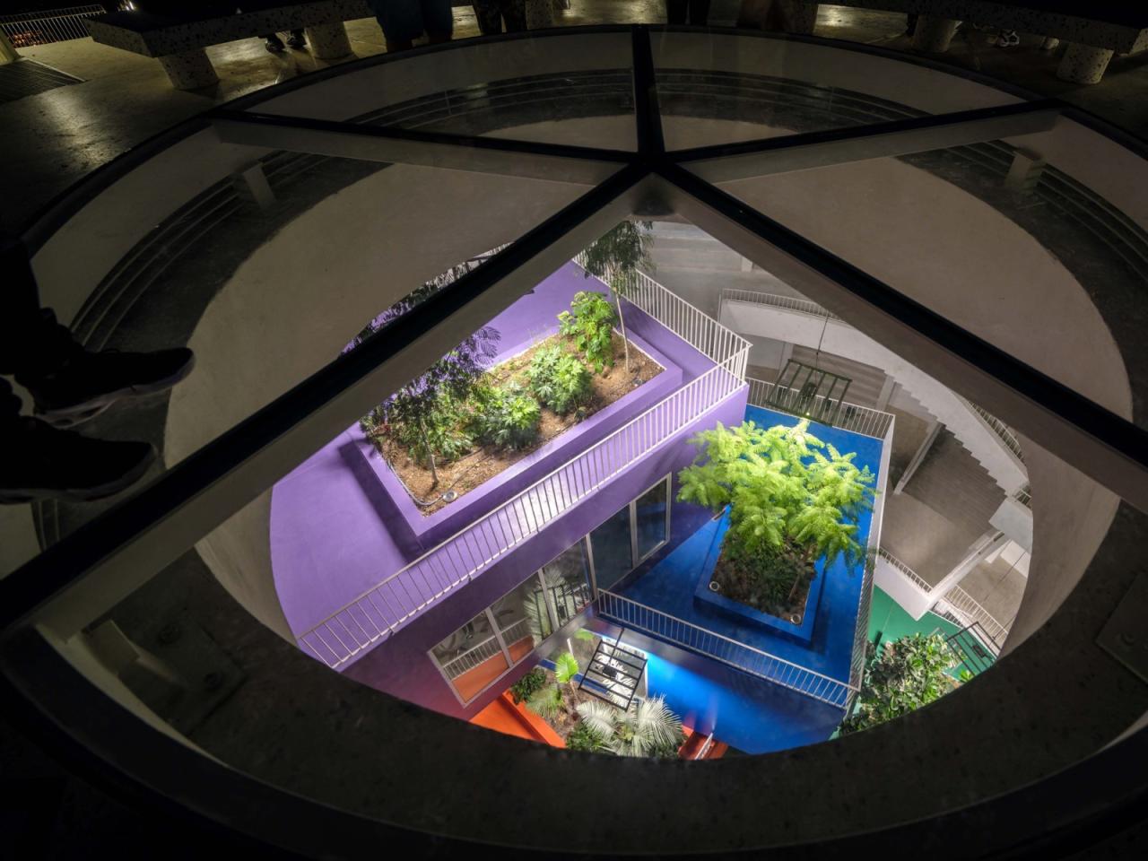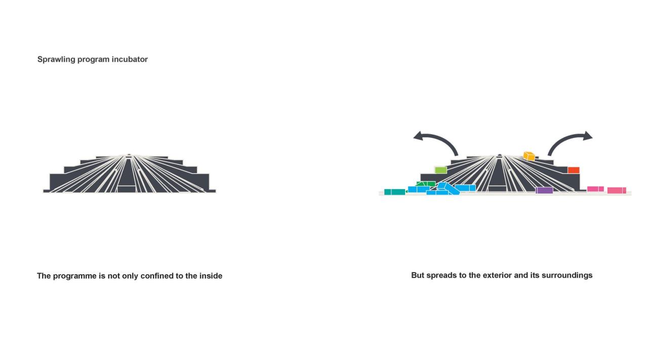 MVRDV 设计团队的作品将现有结构包围起来,并以该结构为蓝本,添加了可供公众使用的空间以及用于教育和活动的盒子。一摞摞彩色盒子散落在建筑内部和周围以及公园里,里面有用于教育和活动的房间。建筑顶部和建筑前方的公园中也有这些色彩斑斓的附加物,使周围环境充满了节日甚至“非法占据”的氛围。