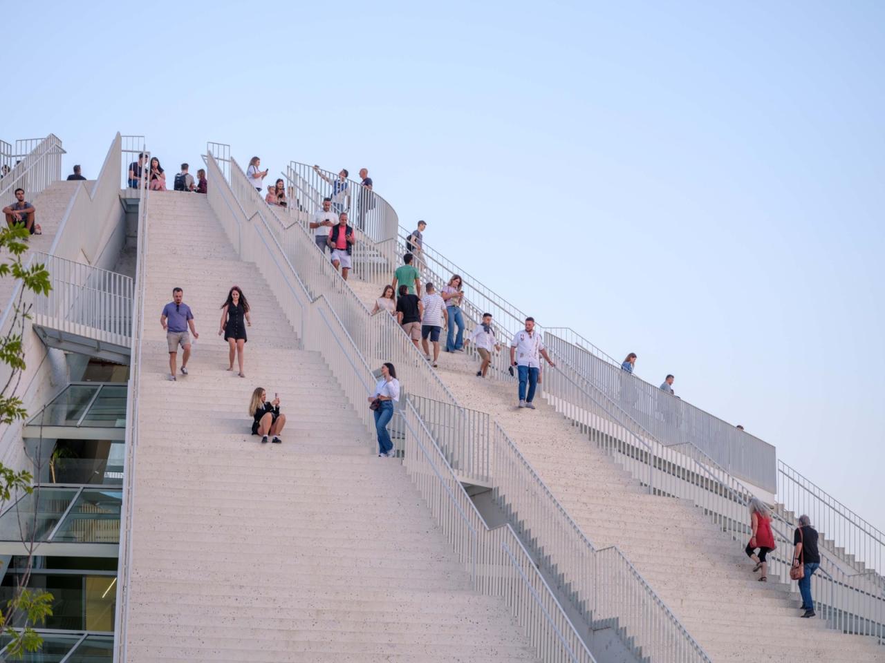 对于许多阿尔巴尼亚人来说,金字塔是战胜政权的象征,而 MVRDV 的设计灵感则来自于他们对这座建筑的改造方式。独裁者去世后,这座破败不堪的建筑长期以来一直是地拉那年轻人的聚集地,他们会爬上倾斜的横梁,然后再从上面滑下来(这并非没有风险)。现在,倾斜的两侧拾级而上,不同年龄段的人都可以爬到楼顶。在西侧,有一部升降机可以让那些无法攀爬台阶的人到达金字塔顶端,而有一根横梁上有一个倾斜的部分,人们仍然可以滑到底部。