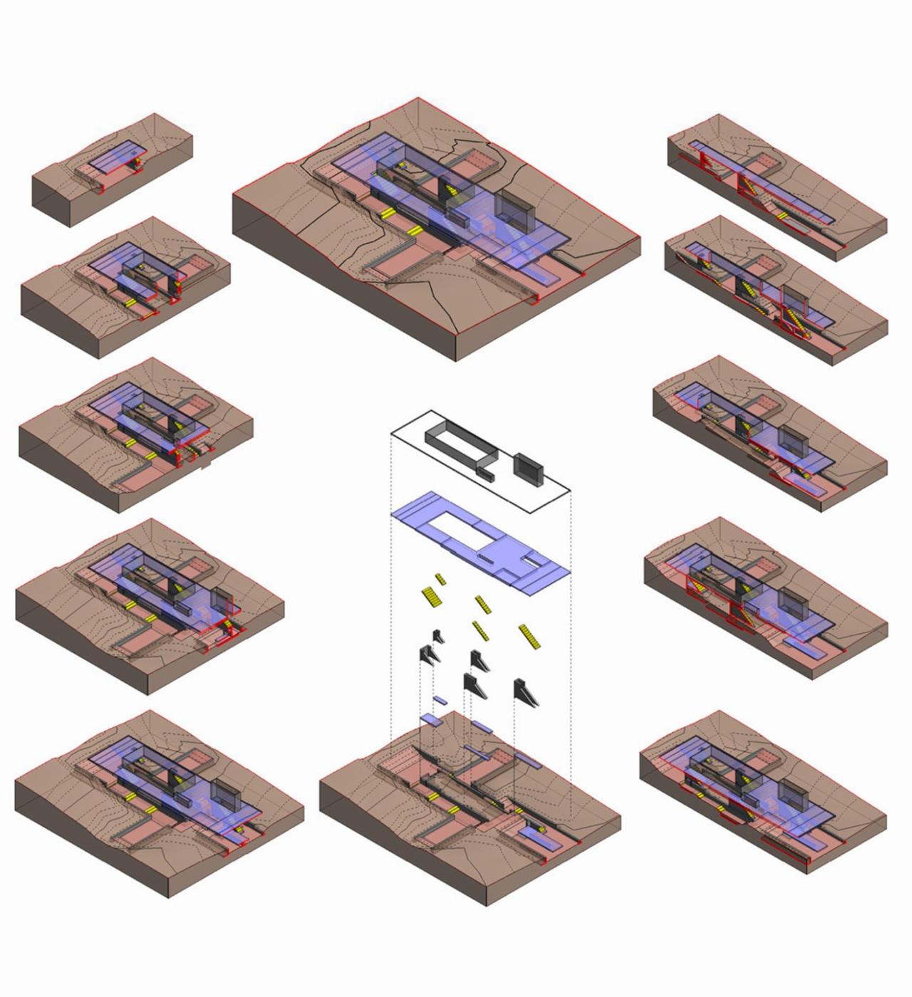 因此,建筑的设计使用了一个放置在场地上的平面,以比较场地的坡度和认识场地的条件,同时,该平面也是一个功能空间。