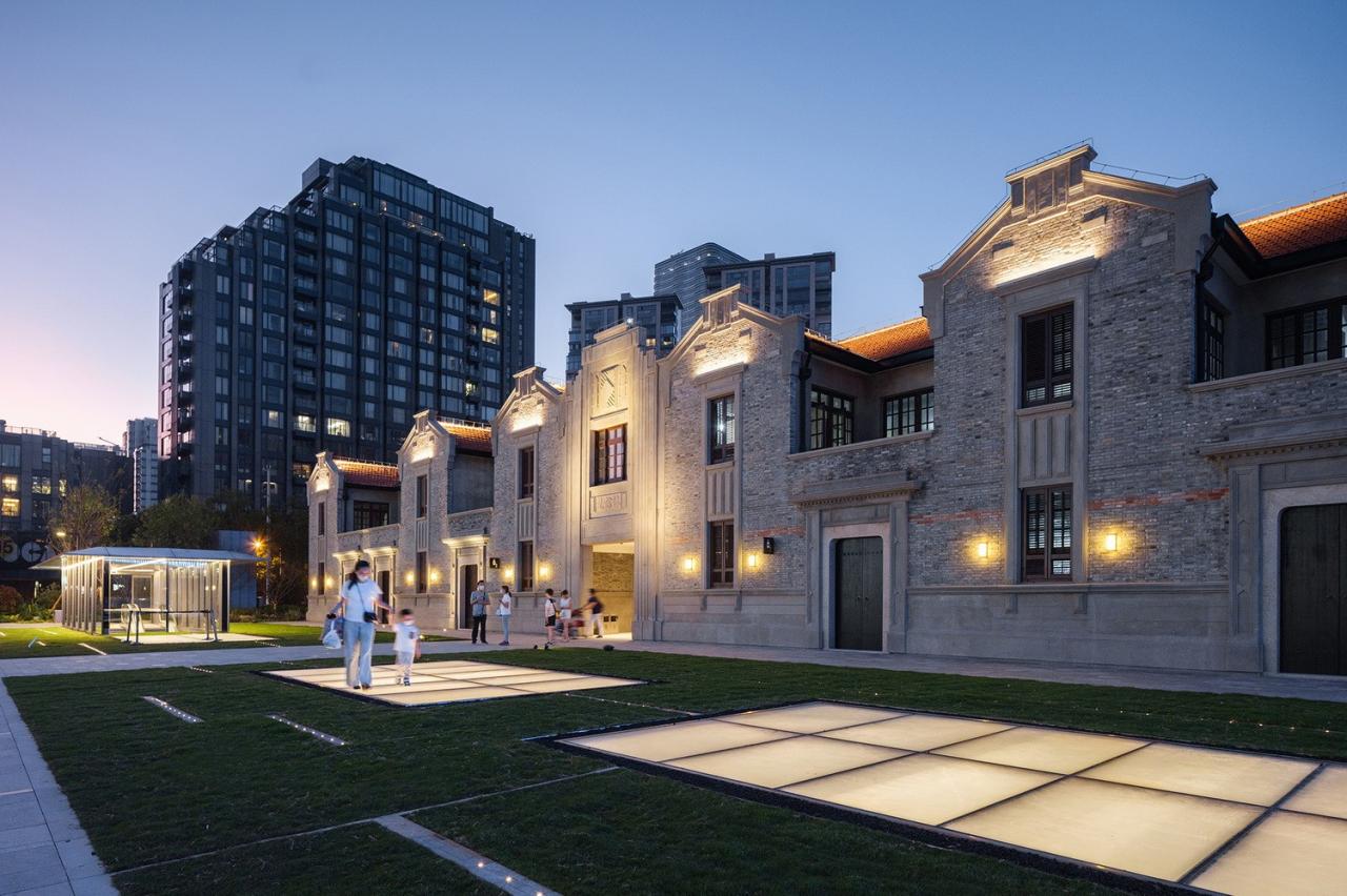 对于场地现存历史建筑的纪念也运用了植物。天后宫曾经的柱点以草坪的形式展现,而慎余里广场天窗和草坪的则组成了石库门建筑的平面。天窗将光线引入室内,晚上室内的灯光也会从地面透出,渲染另一重氛围。