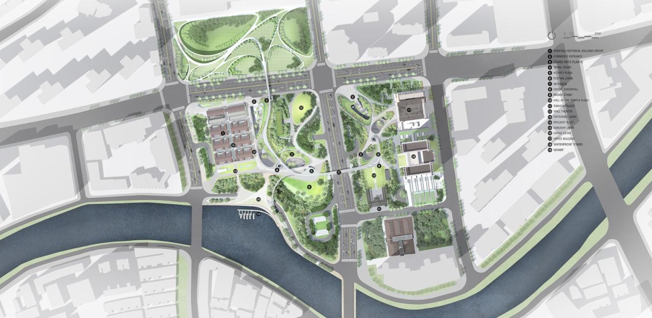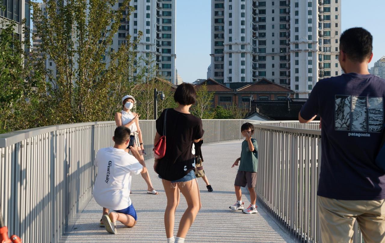 链接在设计前,苏河湾原本由几个零散的地块组成,中间有宽阔的车行道通过,让地块之间的穿行显得极为不便。为了打造一个连续的公园空间体验,景观设计使用了统一的语言,增加了人行天桥,将不同的地块,在视觉上和功能上都链接起来。