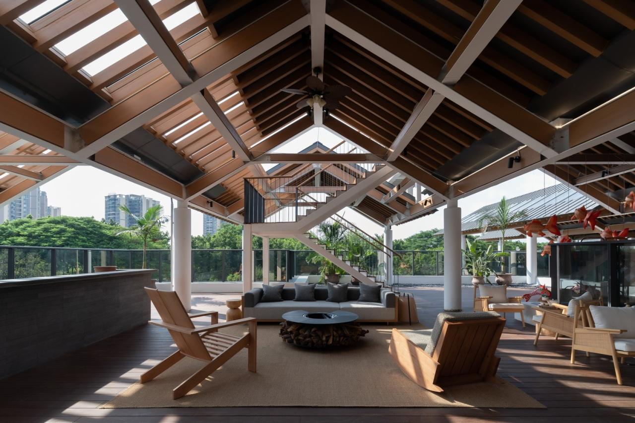 沿着屋顶楼梯往上走,是一处位于屋顶之上的观景平台,观景平台位于建筑最高点,在平台上放眼望去,周边景观尽收眼底。