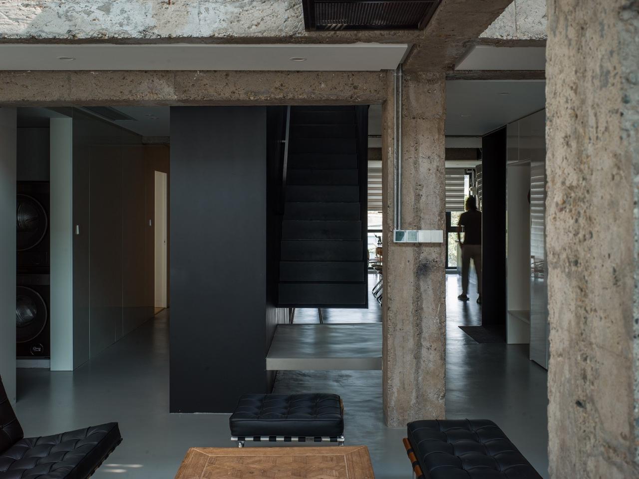 居住氛围设计通过对原始房屋材质的梳理,创造出轻松的居住氛围。空间色调以黑、白、灰加木色为主导,木色部分为必要的固定家具、柜体、房门和新建的轻质墙体;灰色部分为水泥地面、裸露的原始建筑梁柱构件;白色部分为天花吊顶、墙面和部分固定柜体;黑色部分以楼梯、扶手、入户门套等细部构件为主。清晰的材质逻辑,从梁、柱到楼板、墙体到轻质墙、柜再到局部构件,形成一套自然轻松的视觉系统。