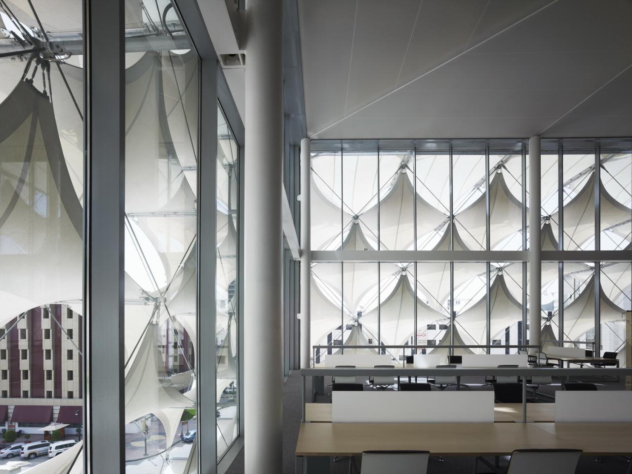 国王图书馆的立面设计是一大亮点。菱形遮阳元素交错包裹玻璃幕墙,若隐若现。膜状结构象征着阿拉伯传统文化中的帐篷形态,在满足艺术造型的同时也兼顾了功能需求。这一独特的遮阳系统因当地气候做了进一步的优化,采用玻璃纤维编织,并覆盖特殊涂层材料,将太阳光穿透率降低到7%。