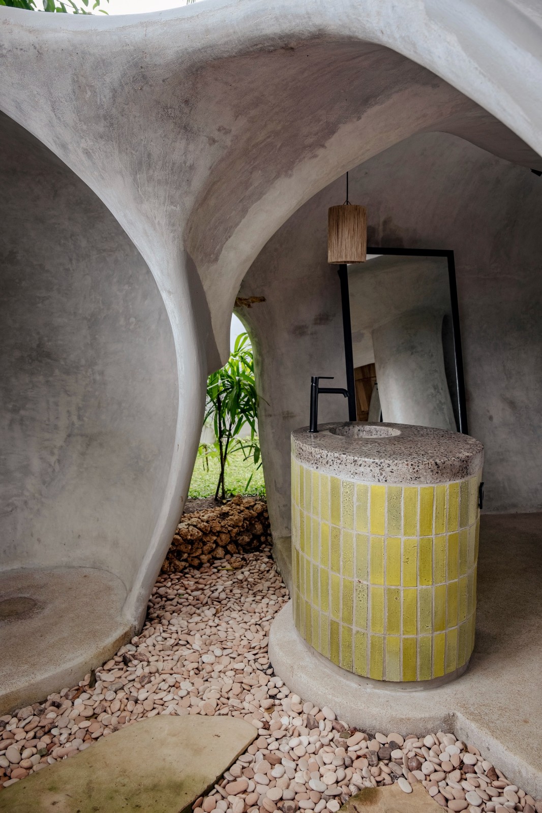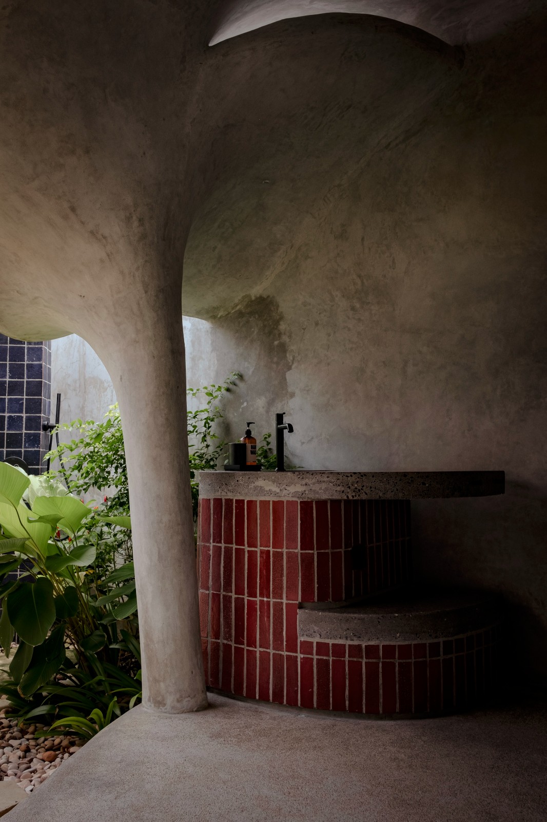 在潮湿的地方,通常代表刚性和工业的水泥通过使用“铁水泥”变成了有机的、可塑的、轻质的和不可预测的元素。通过这种调整,可以控制自然采光、空气流通和私密性。