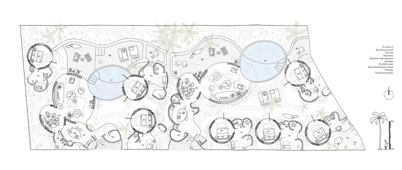 平面图这些房屋位于巴厘岛南部的佩卡图半岛,其空间结构灵感来自巴厘岛的传统住宅。一个较公共的中心空间分配了白天的区域,而较私密的模块(夜间区域)则分布在其周围。确保每个空间都有多个循环和出入口,并促进它们之间的各种互动、连接、重叠甚至叠加,从而增强空间的丰富性和路径的流动性。这种丰富性是一种重要的工具,可以让用户在一天中的不同时间以不同的方式体验房屋。同时,我们非常重视景观设计,将其视为建筑和室内设计不可分割的一部分,存在于所有空间中。随着时间的推移,景观逐渐取代了建筑结构,确保了私密性,使人沉浸在体验和场所之中。