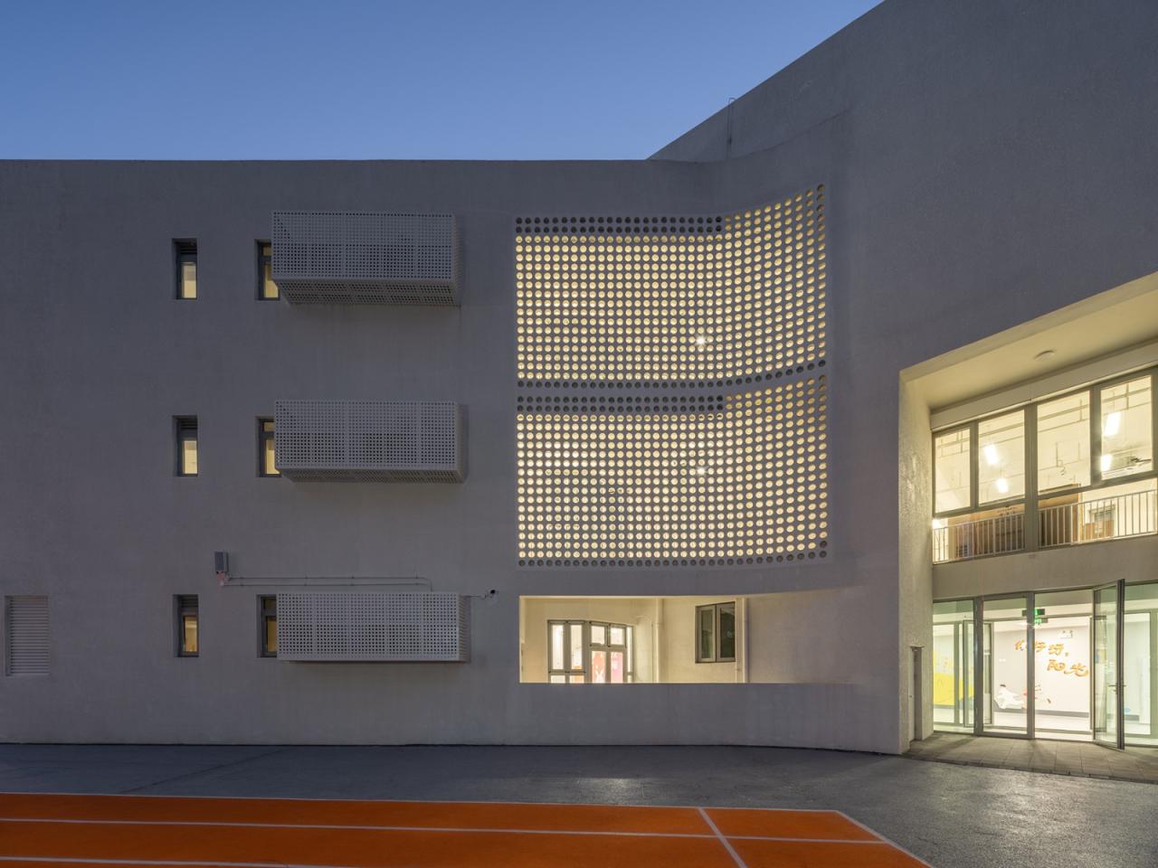 幼儿园共为三层。十二个生活单元的窗户根据日照条件分布,使每个房间在获得最佳光照和朝向的同时,也在建筑立面上创造出一种有节奏的韵律。