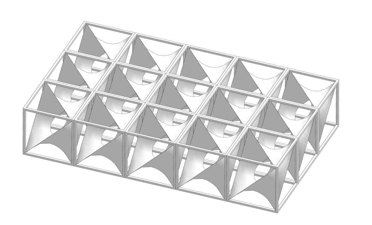 双曲面的反射板由六条直边形成,六条直边分别是天窗框架单元六个面的对角线。反射板为定做的成品GRG,通过对角线与天窗框架连接安装。