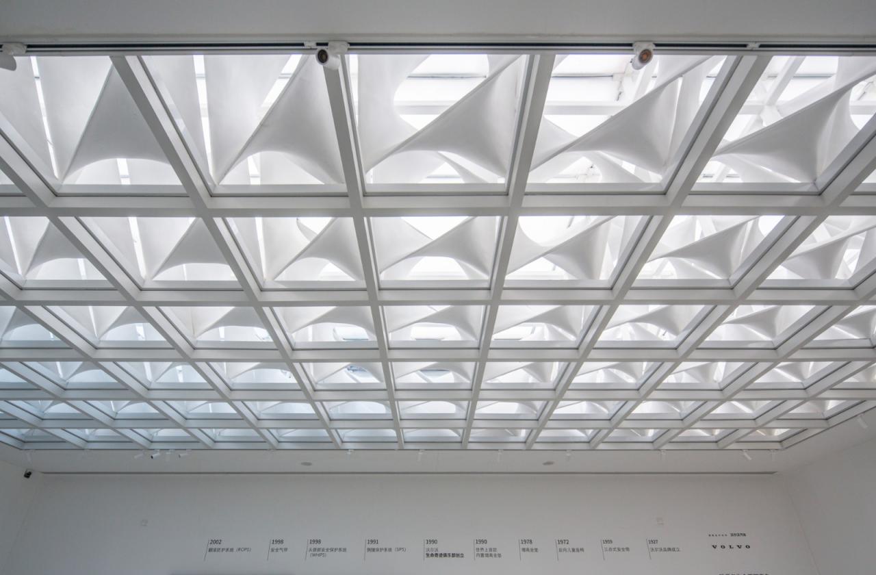 建筑顶部东西两侧分别有两个较大的斜坡天窗,分别对应接待空间和展厅的入口空间,空间较高,有天光倾泻而下。中部展厅的顶部为网格状的大天窗,几乎占满整个空间。每个格子中放置一个双曲面的漫反射板,用来分散光线,以形成较为均匀的自然光。