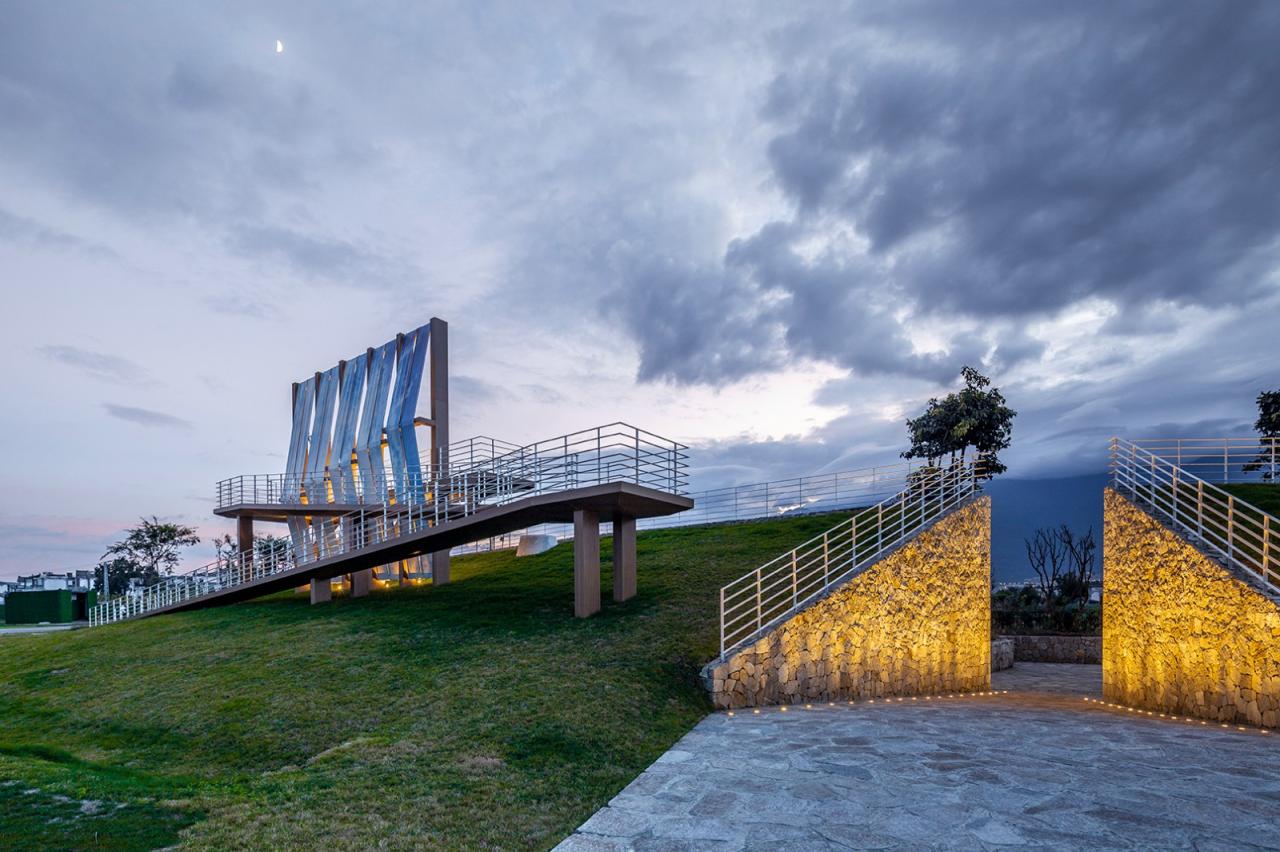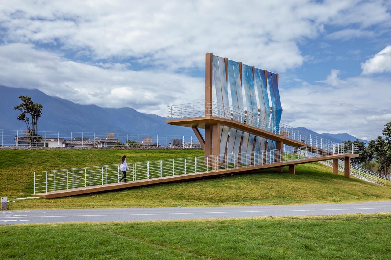 建筑屋顶是倾斜的,覆土后形成了面向绿道和洱海的微地形。游人可以在这个绿丘上散步、坐卧,交谈。观景台及风帆装置耸立在绿丘之上,成为区域的标志。它们由6根钢结构桅杆支撑,风帆由双面悬挂10幅定制扎染图案的户外帆布组成。通过Z字形的坡道,人可以到达位于6.5米标高处的观景平台。这里是环洱海绿道公园稍有的高点,人可以越过树梢,远眺洱海景色。