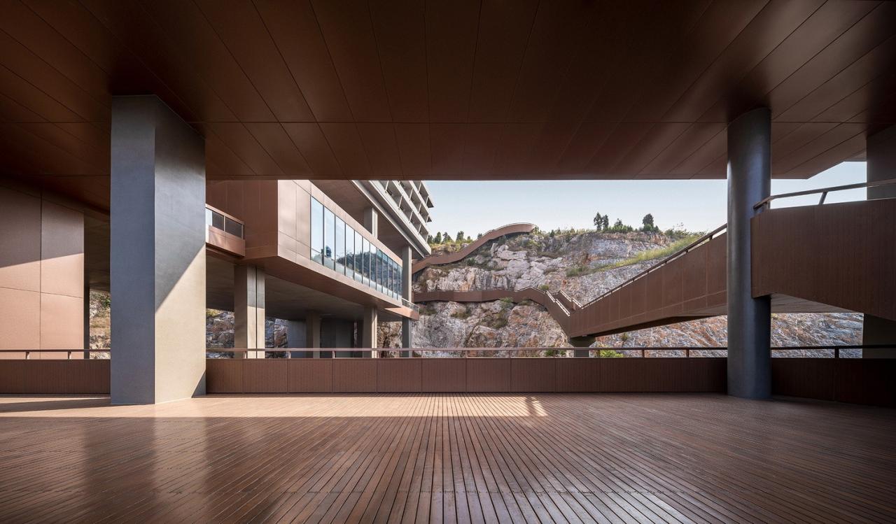 依山观湖,织补宕口,悬空建筑,立体园林“虚处藏实,实处含空。旁逸斜出,得其园中。移步换景,时时见峰。宕口织补,巧夺天工。”一首律诗充分表达了设计师在创作宕口酒店时的愿景和精髓。为了使酒店自然地融入山水环境,织补破碎的山体,并获得更为高远的观景视野,建筑设计采用了化整为零的手法,将建筑分解成若干个较小尺度的体量,错落有致地布置于不同的标高之上,悬空体量之间的留白形成了多层次的立体园林空间,辅以栈道相连,形成一条由酒店通往山顶的环形路径,为游客提供攀山、渡桥、望湖、归园等丰富的空间体验。