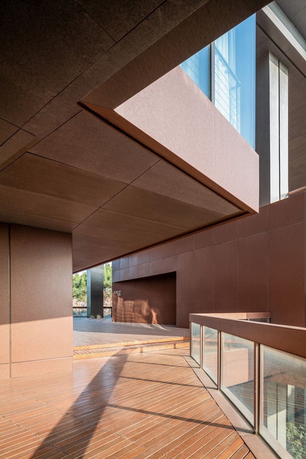 为了遮蔽40米高的裸露崖壁,也为了使更多的客房获得开阔的视野,建筑大量采用架空的处理手法,拔高建筑高度,酒店旅客既可以透过架空空间远眺北侧的湖光山色,园区游客也可透过架空空间隐约看到酒店背后的崖壁。建筑五层架空平台处,朝向崖壁设置有一间空中咖啡吧,高挑的灰空间为咖啡吧提供了舒适的外摆空间,是旅客休憩交流的好去处。咖啡吧顶部开有天窗,旅客即使在室内也能仰望星空。