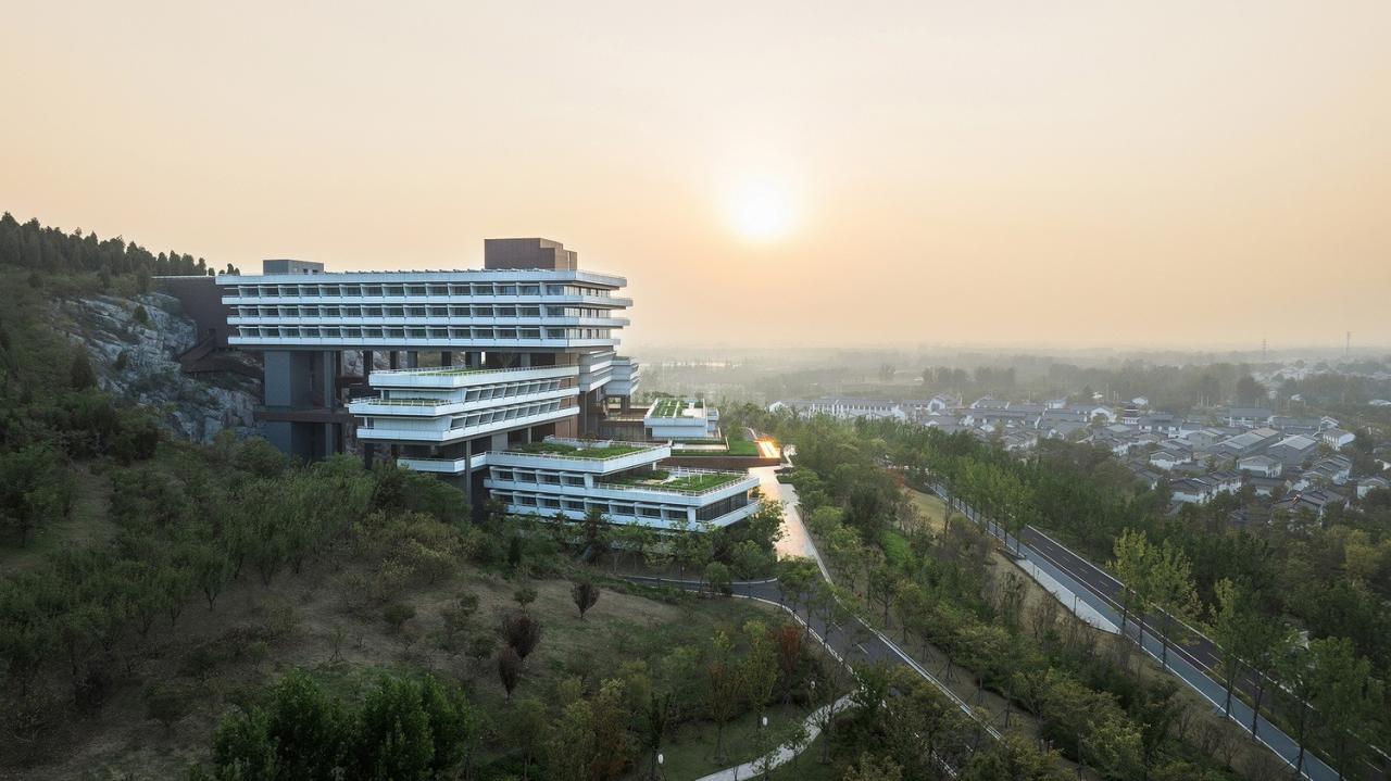 第十三届中国国际园林博览会园博园位于历史文化名城——徐州市,园区四周山岭环抱,山水相映,景色宜人。宕口酒店作为此次园博会的重要配套工程之一,居于园区西南角的半山腰处,北侧为园博园主景区和悬水湖,视野开阔。
