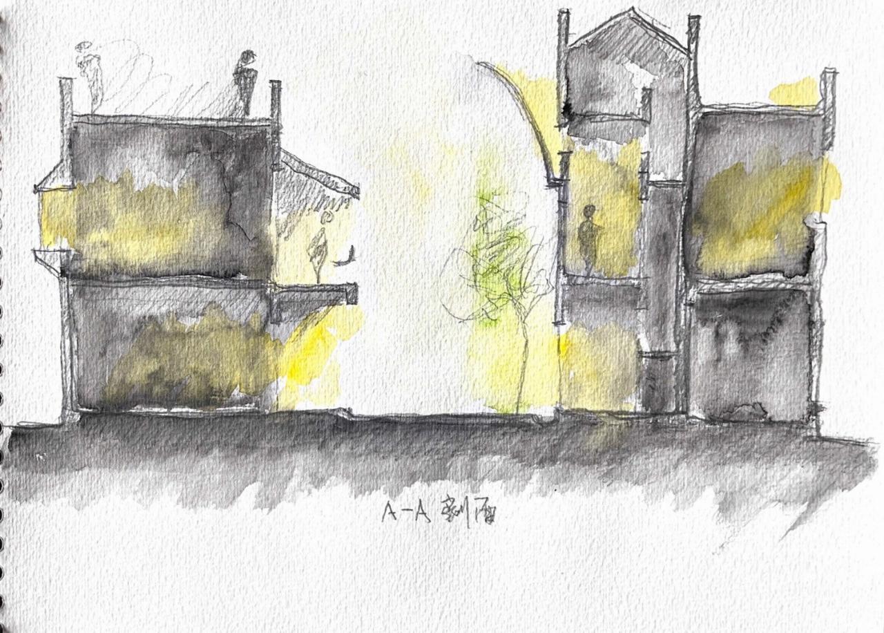不过踏勘时我站在场地中,看着周边青瓦白墙与层叠错落的马头墙。远处炊烟升起,隔巷听着传来的声音,柴火烟熏味中夹杂的饭菜香味飘入鼻中。我忽然觉得是不是可以抛开一些固有的印象及标签,从实际的场地出发,将建筑隐匿在村落中,创造一个内向型的独处世界。融入村落却又能与外部看似杂乱、错综、多样的环境有着极度反差的空间!