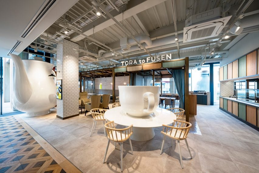 露台似乎在场地的西南角向上剥落,形成了一个垂直表面,上面用金属字体显示了项目的名称。在咖啡馆里,巨大的杯子和茶壶被用来制作桌子和雕塑,延续了外观的趣味性。办公室本身更为简约和低调,简单的内部装饰通过大窗户勾勒出周围家具的景色。日建设计公司表示:“玻璃盒子的设计抽象而简单,只是作为家具的背景,”
