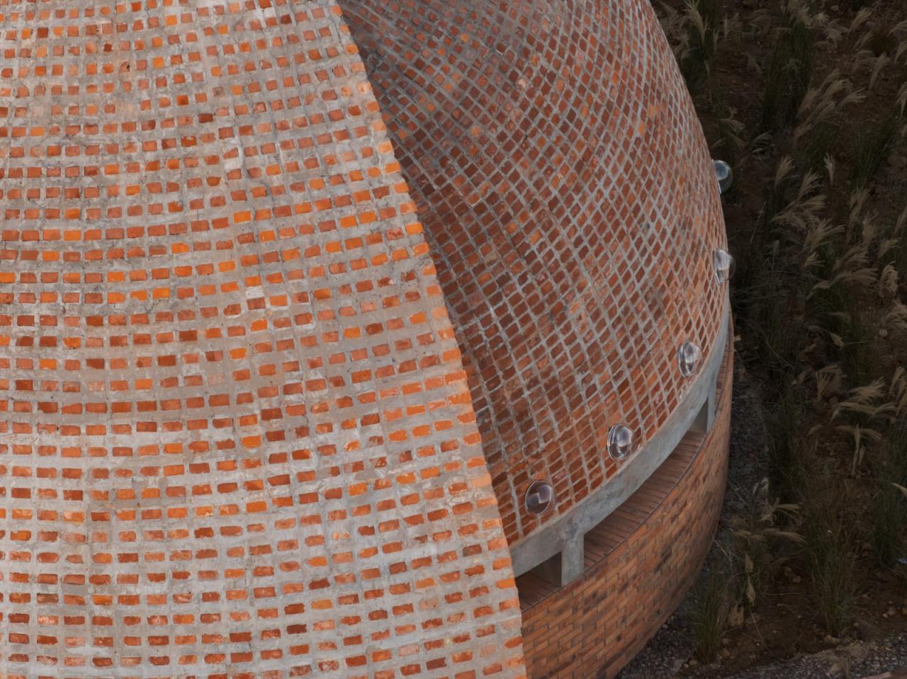12种宽度的切割砖顺uv线分布,以保证结构径向的连续性。砖壳由此形成了新的建构逻辑和视觉表现。从层叠咬合的砌筑,成为网格化的浇筑。像素化的点阵分布颠覆了砖的建构印象。
