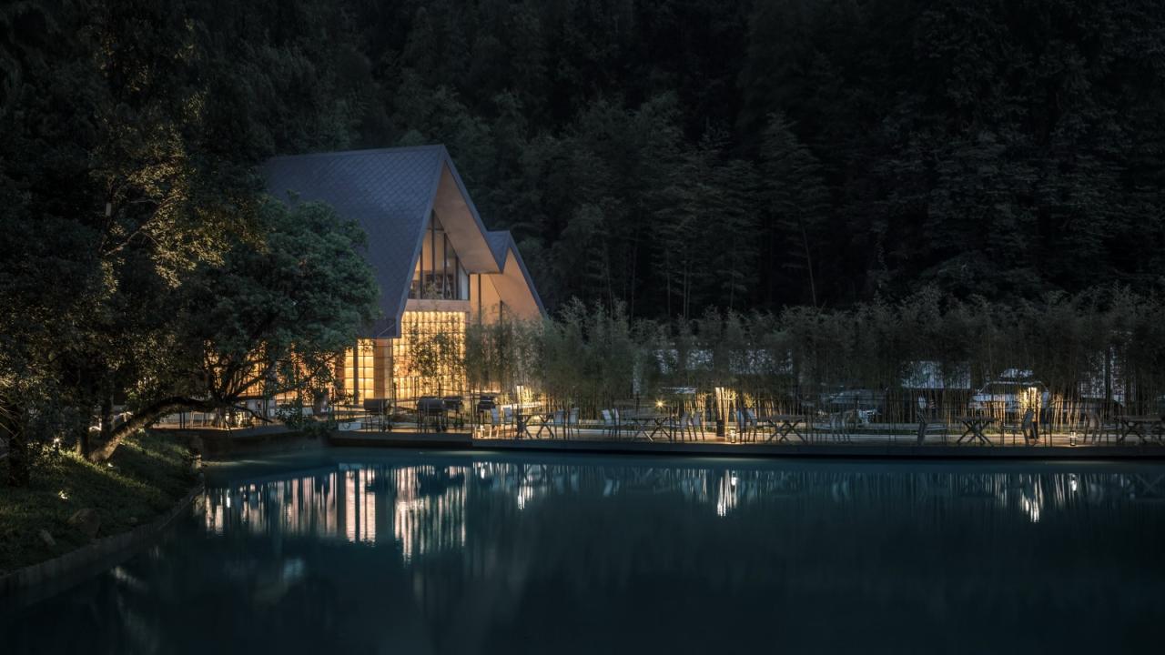 由于原有建筑体量已不能满足新的功能需求,经过谨慎评估,很遗憾地将整体建筑进行拆除重建。带着这份惋惜,我们设想延续原有建筑的气质,以人字屋面为原型,用高低不一的两个单元形成新的连续屋面形式,与墙体乃至地面连成一体。重复叠落的屋面使建筑体量得以极大地削减和弱化,让建筑嵌入山体之中,回溯建筑与环境的关系。