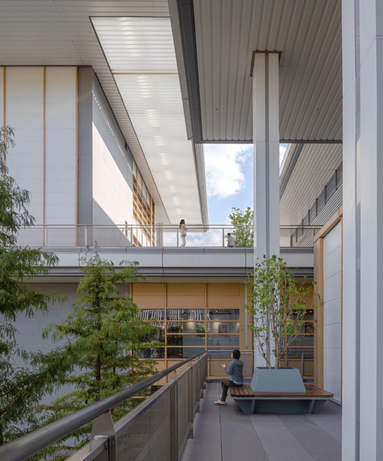 两馆内各类丰富的兴趣活动都是报名预约的。除了参观者,每一个来参加活动的人都有其第一目的地,比如某间教室或某个剧场。使用者从东西大堂或花园平台入馆,进入不同类别的平台,通过逐级变化的集散空间来到目的地。在每块平台上,教室之间的公共空间不再是单调的交通走廊,而是尺寸不一、富于变化的步行街区,包括室内街道,也包括由平台出挑的室外露台,人们在各个楼层都可以随时步入户外,在小树和座椅间休憩交谈,享受外部城市和绿化的景色;而在上下左右不同的平台之间,我们还设计了各种公共楼梯和连桥,希望它们以欢迎的姿态邀请使用者路过、漫游或造访其它的兴趣平台——我们期望这一立体的平台聚落能够激发人与人、人与自然的积极交互,不仅能让使用者在自己预定的课程时间与同好密切交流,也能和在预定课程之外的时间里自由探索其它的兴趣爱好。在我们的设想中,鼓励多元融合和跨界交互也是未来公共建筑应该具备的重要品质。