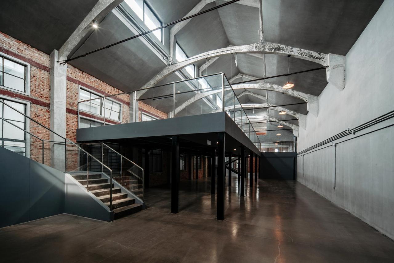 原复摇车间、煮茧车间、蒸茧车间、选茧车间被定义为对外出租的文创办公空间。其中复摇车间有大小两个开间,屋面均依靠拱梁支撑并带有高侧窗,在阳光照射下格外明亮。得益于地面下挖对原始结构钢索下净高的缓解,我们可以在其中植入夹层以满足新增的办公面积需求。大开间通过局部夹层处理形成纵向的视觉引导,同时保留部分原始生产车间的尺度,形成新与旧的对话;小开间通过整体夹层处理将高处的拱梁序列拉近到眼前,重塑空间体验。