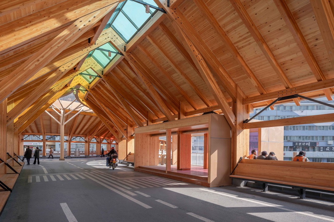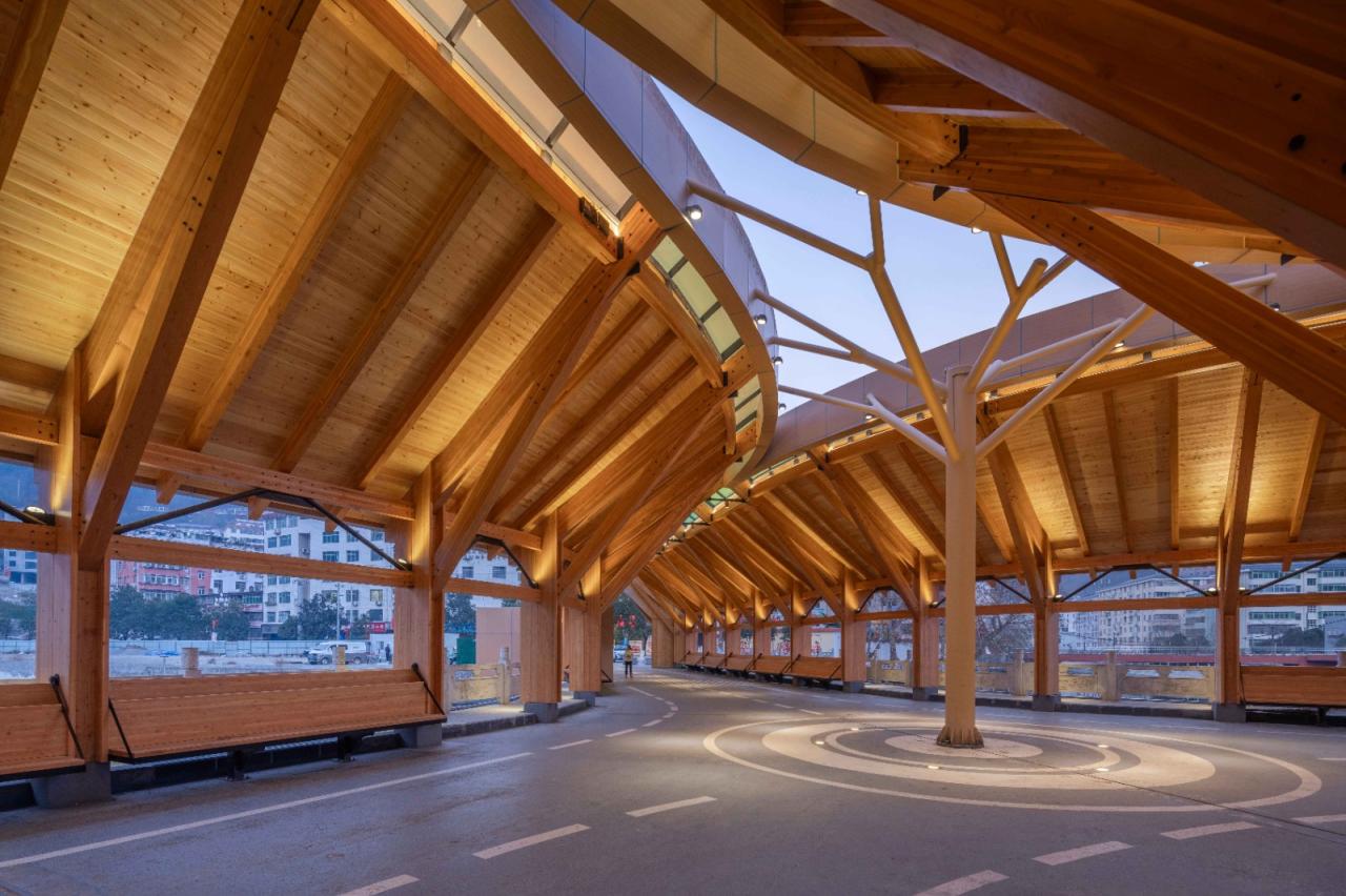 廊桥主体采用木结构,木材用量约为160立方米,固碳总量约144吨。以坡顶门式框架为主体,并将双侧立柱加以斜撑。整个榀架均由花旗松胶合木为结构主体,通过6根胶合木构件连接而成。同时为了表现立柱的片状体积感,每根立柱两侧使用50mm厚的红雪松胶合板夹住,既丰富了结构表面的建构层次,又为排水照明等设备预留了隐藏空间,还可对主体结构进行适当保护。