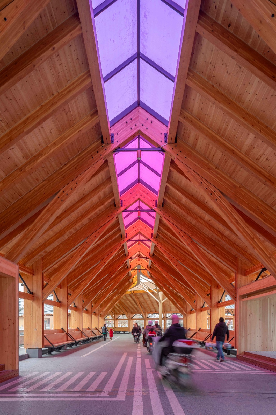 屋顶正脊部分开设天窗,配以彩色玻璃,彩色玻璃从红至蓝,代表了时间。光线透过天窗照射到廊桥内部,为廊桥平添了浪漫的气氛。为了使彩色玻璃更为连贯和通透,正脊处的主梁被位于两侧的次梁取代,这样的处理也让屋顶显得更为轻盈。屋顶外表皮使用了镀锌钢板,在回应传统青瓦肌理的同时,又使建筑更具有当代性。