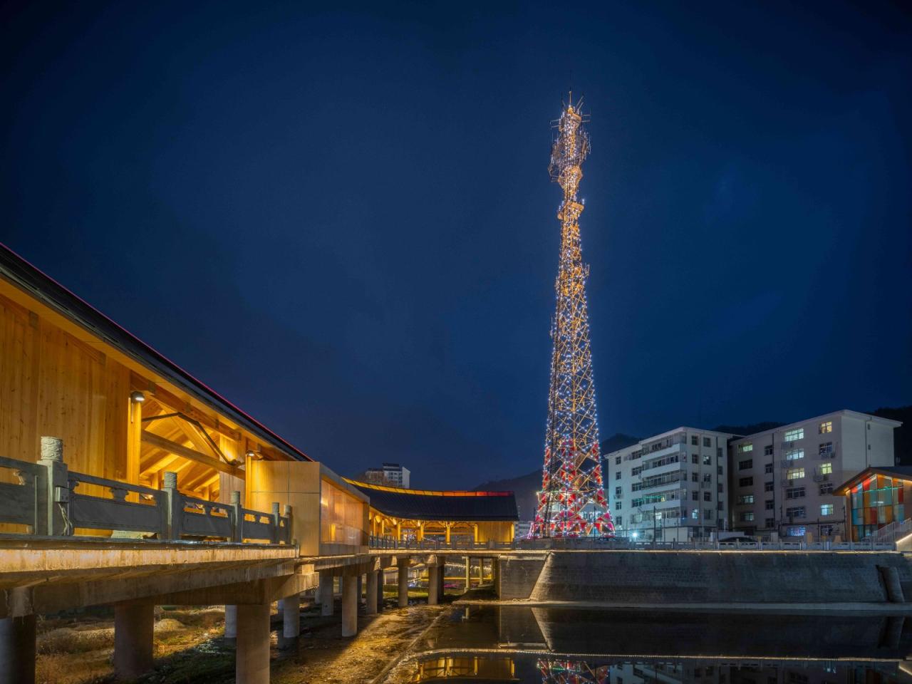 信号塔位于商业街的南端,人字桥西北侧,既是区域内的制高点,也是康县最高的构筑物之一。但信号塔超大的体量和工业化的造型和商业街的氛围并不相符。如何在不影响信号塔工作的情况下,对其进行改善是设计师需要解决的问题。