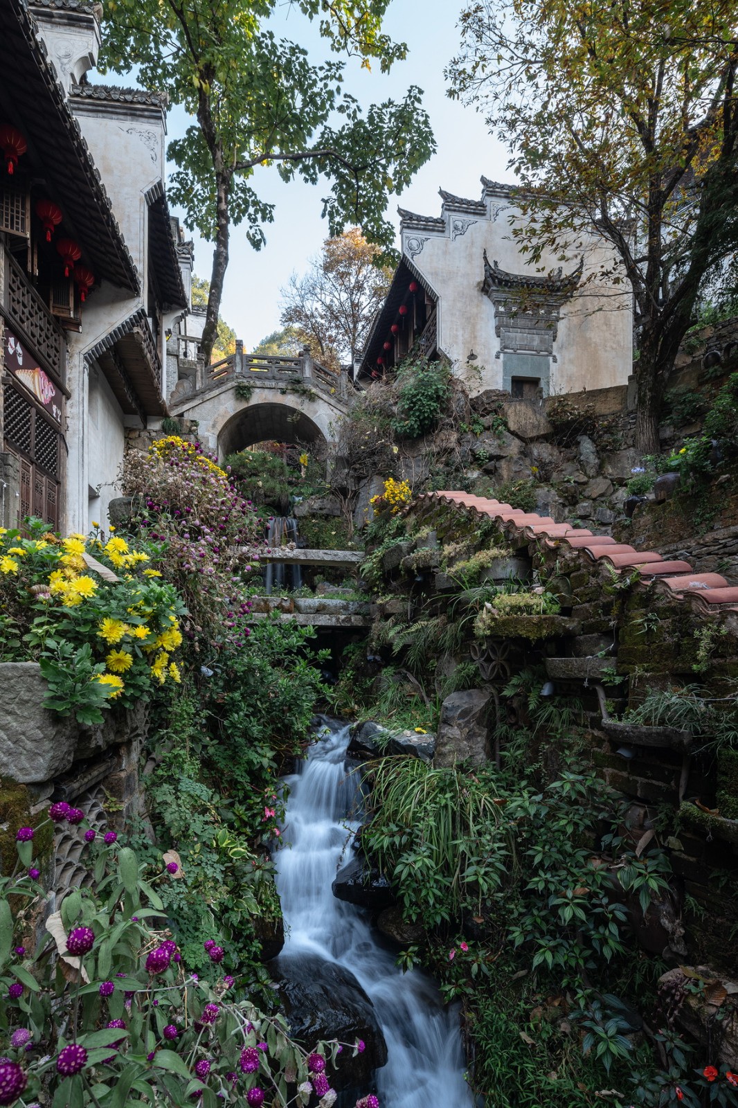 地质灾害造成黄土碎石雍塞山谷,施工难度大,交通运输非常困难。设计团队化困境为机遇,巧妙利用滑坡后改变的地势,就势修建为篁岭第二条极富特性的街道“花溪水街”。