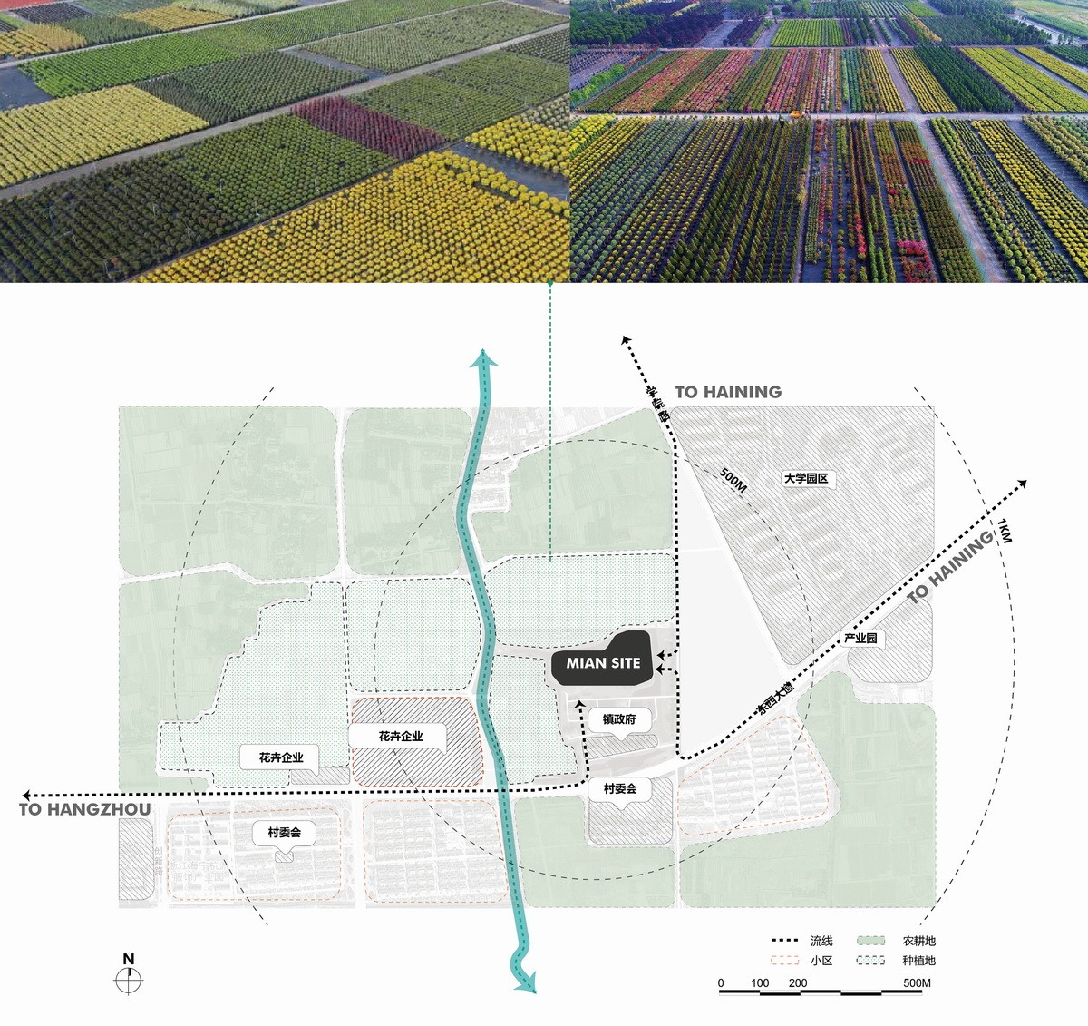 作为田园示范区的一部分,立足于特色的产业基础,海宁长安国际花卉产业园衔接了国际花卉城,且与周边的花园苗圃仅一水之隔。场地范围内主要用地为大面积的种植用地,生态环境良好,上塘河从基地北侧穿过,支河沿南侧贯穿整个场地,并将场地划分成几个组团半岛。建设用地由存量宅基地组成,沿河道集中布置,遵从田园产业与村镇聚落的布局,基地也因此与自然环境交织在一起,产业办公与研发的人员在绿色生态环境下工作,与自然共生长。