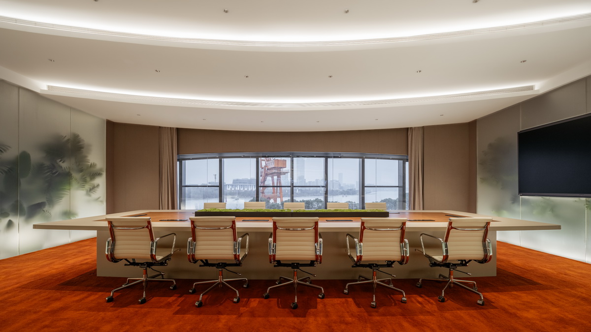后面是绿色葱郁包裹的仿佛林间的大会议室,它面对的正是缓慢东去的真实的黄浦江。现实和想象在这个时刻和地点交汇。