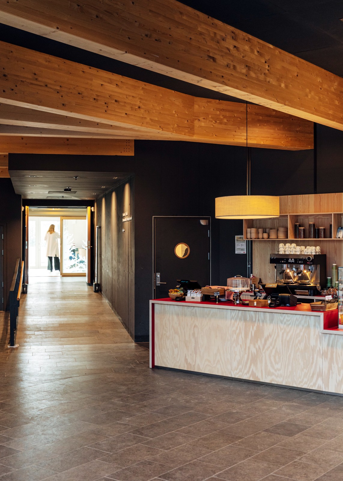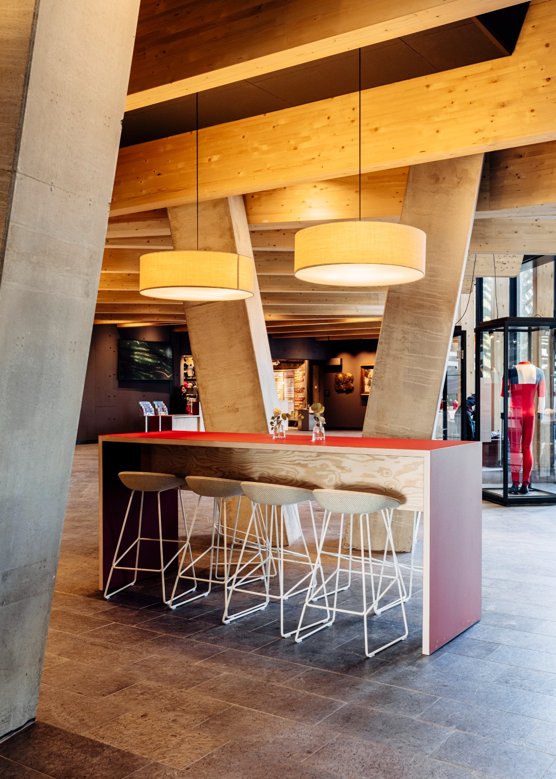 向 1952 年奥运会致敬。固定内饰和吧台桌由松木胶合板制成,表面铺有红色油毡。软垫椅和长沙发采用挪威羊毛纺织品。立方体桌子由客户 Skiforeningen 使用霍尔门科伦(Holmenkollen)周围森林中的松木原料手工制作而成。灯具通过北面的玻璃幕墙延续了包层的运动轨迹,也是特别设计的。