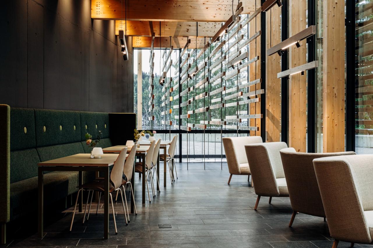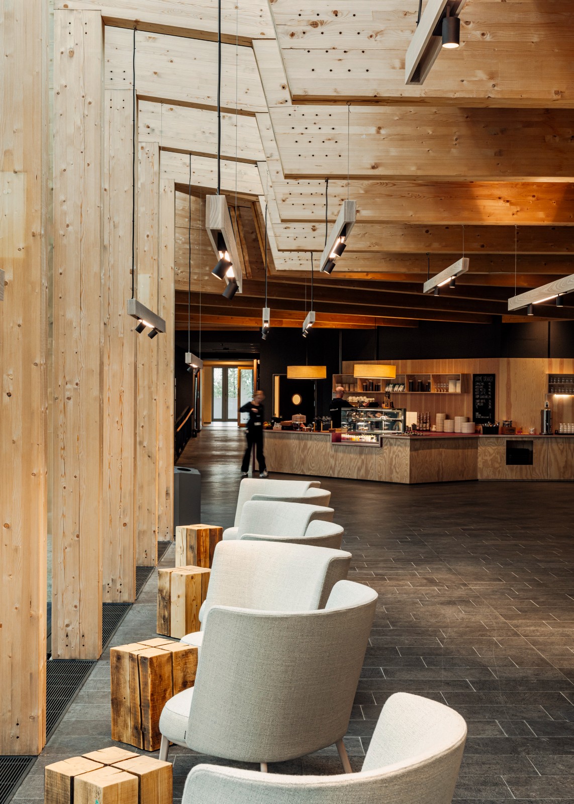 软硬结合。支撑跳台滑雪场的巨大混凝土支柱在之后新建的扩建工程中自然清晰可见。胶合木框架作为新建筑的主体结构,成为现有的硬质材料和新的软质材料之间的直接交汇点。建筑北端增加了外墙木条的密度,以起到遮阳的作用。当太阳出来时,日光透过外墙,在室内的石板地面上投下阴影,而到了傍晚,效果就会截然不同。