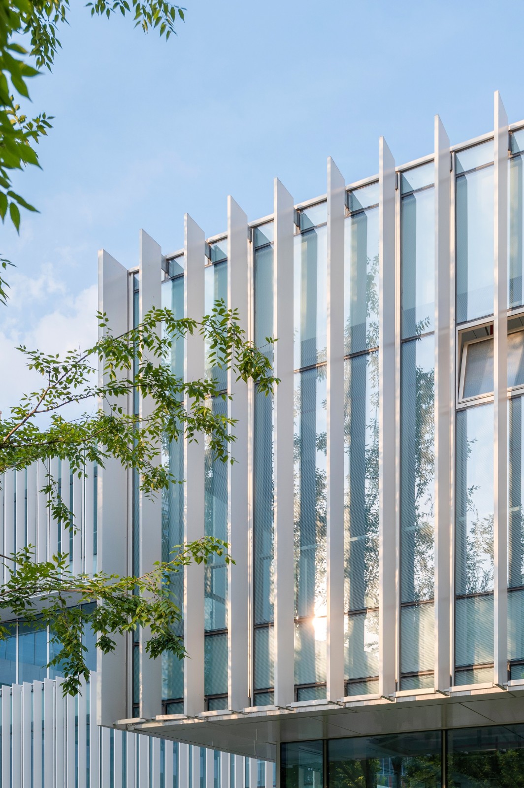 绿色节能建筑受场地限制,呈东西向布局,因此,在满足室内空间光环境的同时,也充分考虑了西晒面的节能需求。设计结合建筑竖向分区采取以下策略:低区错叠悬挑的小尺度体块,一方面因其产生的阴影本身具有较好的遮阳效果,另一方面,其外覆以竖向格栅和彩釉low-e玻璃,有效遮挡阳光的直射;高区展览空间采取双层呼吸式幕墙,外层采用彩釉low-e玻璃,内层采用U型玻璃,两层玻璃间为1200mm宽的通风空腔,空腔内热空气通过顶部通风格栅带走大量热量,即使在炎热的夏季,室内U玻表面远低于室外温度,有效降低了空调负荷。另外,层层叠叠的绿化屋面在建筑节能和助益海绵城市方面也有较好的效果。