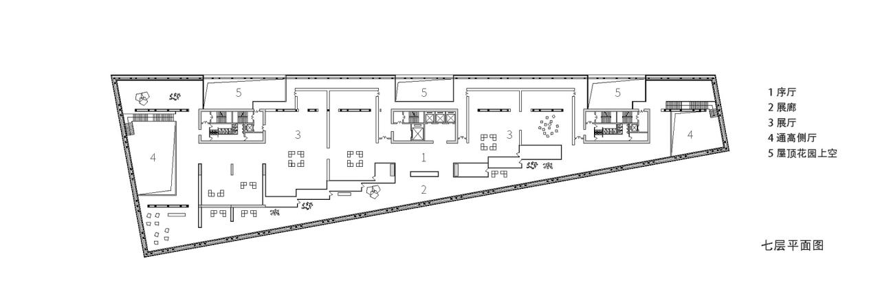 环境友好无论是面对城市街道还是住区,营造建筑宜人友好的场所环境也是设计的重要面向。建筑贴近城市主要街道,其界面虚实有序、尺度宜人。设计结合街道场所,沿西侧设置了宜人的沿街景观步行空间,并于其两端结合城市街角环境、社区活动及幼儿园接送场所,设置了小型的街角公园,供人们停留与交往。此外,设计通过分解建筑的大尺度体量,以虚实相间的小尺度体块构成和空透的空中庭园贴近街道和住区。空中庭园在为人们提供交往场所的同时,也以其通透开放,有效降低了美术馆主体对东侧居住区的压迫感,为相邻的居住区和街道带去了清风、绿意和畅朗的感受。