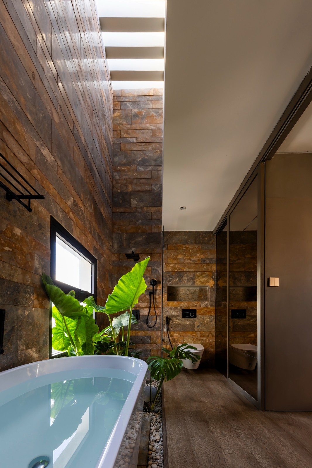 与自然和谐共处体现在卧室和卫生区周围战略性地布置绿化,模拟绿色花园。这不仅减少了室外的灰尘,改善了空气质量,还形成了室内生动、清新的景色。在最高层主卧室的奢华空间里,一个清凉的绿色天堂就像一幅生机勃勃的画卷,从任何角度看都让人心醉神迷。这个花园不仅是房屋的独特焦点,还将主卧室区域变成了屋主精致独特的休闲天堂。由于采用了大面积的玻璃墙,室内与室外的花园天衣无缝地融为一体,营造出无限的开阔感。这不仅展现了绝佳的外围景观,还增强了舒适度和人与自然的联系。卧室不仅是休息的地方,也是在房屋最私密的空间里欣赏自然美景和宁静的地方。