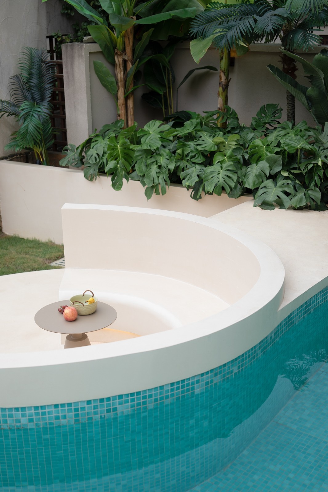 亲子度假风更注重“亲子同乐”,能让父母与小孩共同享受宝贵的亲子时光。院子内的泳池带着夏日的清凉,为入住家庭提供了舒适的休闲场所。围合式环形桌,一旁的长桌,为一家人围坐交流留出了足够的空间。