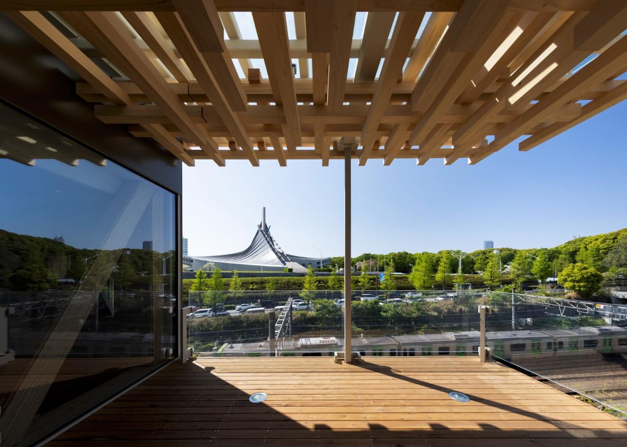 平台的结构像一个平衡玩具,可以欣赏到神宫前林的开阔全景。设计过程的一个焦点是将小木颗粒组合起来,创造一个具有模糊轮廓的结构,类似于建筑工艺项目,与横跨铁轨的丹下健三(Kenzo Tange)设计的国立代代木体育馆形成鲜明对比。