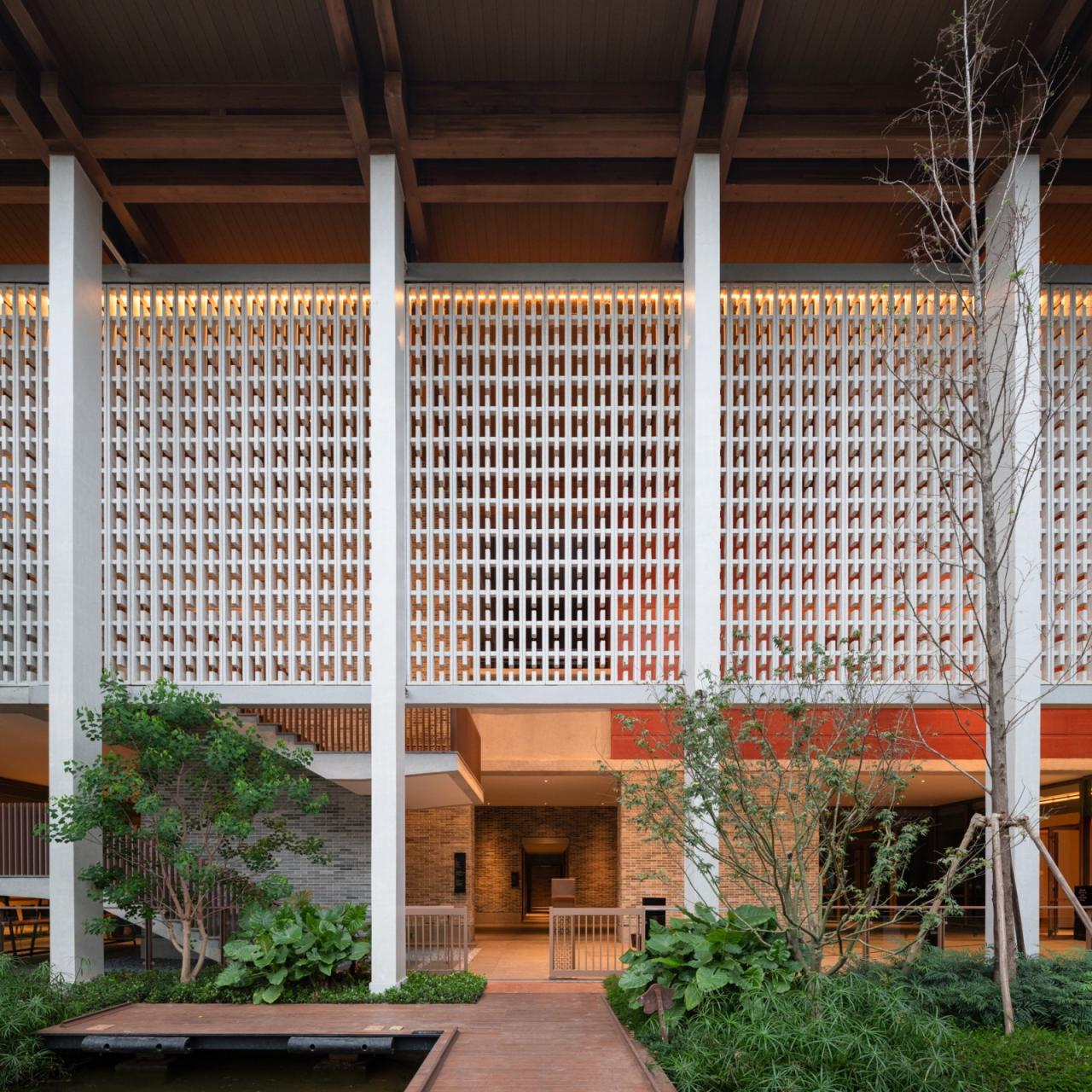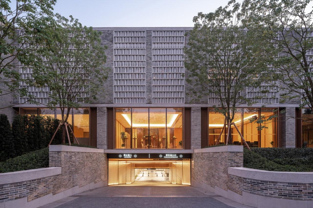最后,镂空砌块既遮蔽隐私又保证通风,其特有的透气感也成为了立面上的亮点。预制UHPC砌块的做法,确保材料具有足够的稳定性及耐久性。标志元素的重复、错动排列,实现了富有韵律的立面效果,也使得该母题成为酒店的记忆点之一。