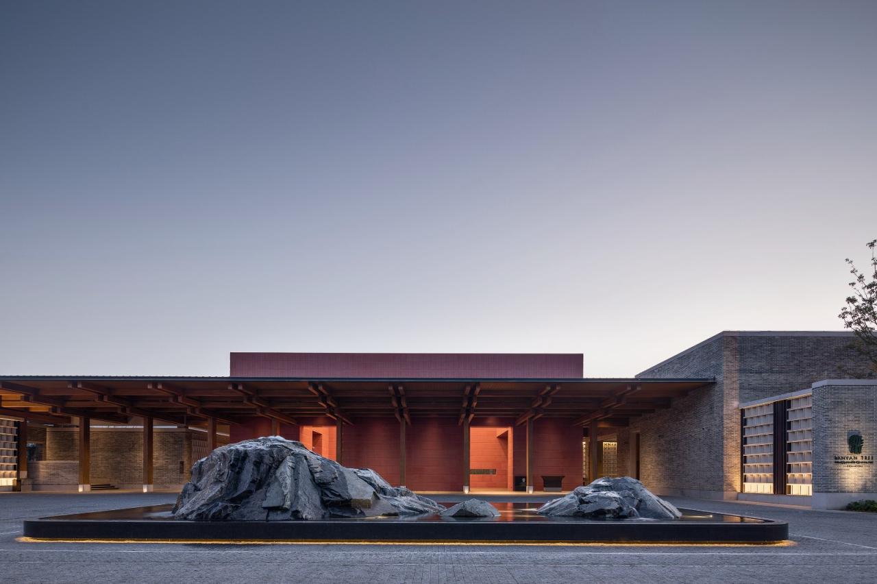 酒店立面采用的材料体系主要源自当地与岭南传统建筑,在呼应在地文化的同时,也通过可回收、可再生的材料提倡了低碳可持续的节能设计理念。首先,回收青砖作为主体材料。经过简单加工后,重新赋予其新的生命力。然后,当地常见的红砂岩,被使用在公区的重要节点空间。