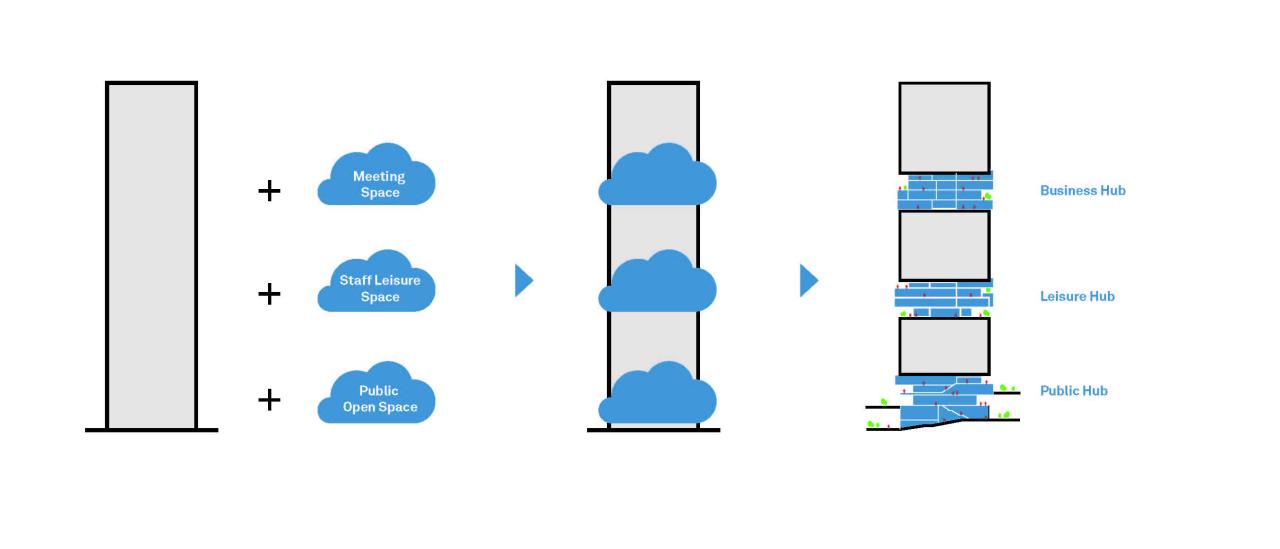 在这里,你能看到有别于传统办公分层分户的空间划分,单一玻璃幕墙之外的空间新释义。一个城市商业综合体的可持续构想,打破隔阂的三大公共功能体块与垂直绿化生态体系的穿插结合,智慧且高效、和谐而统一,构建了一个桥接生活、工作和休闲之地的完整生态体系,让身在其中的人们无需逃离钢筋水泥,也能感受到那份重返自然的美好。