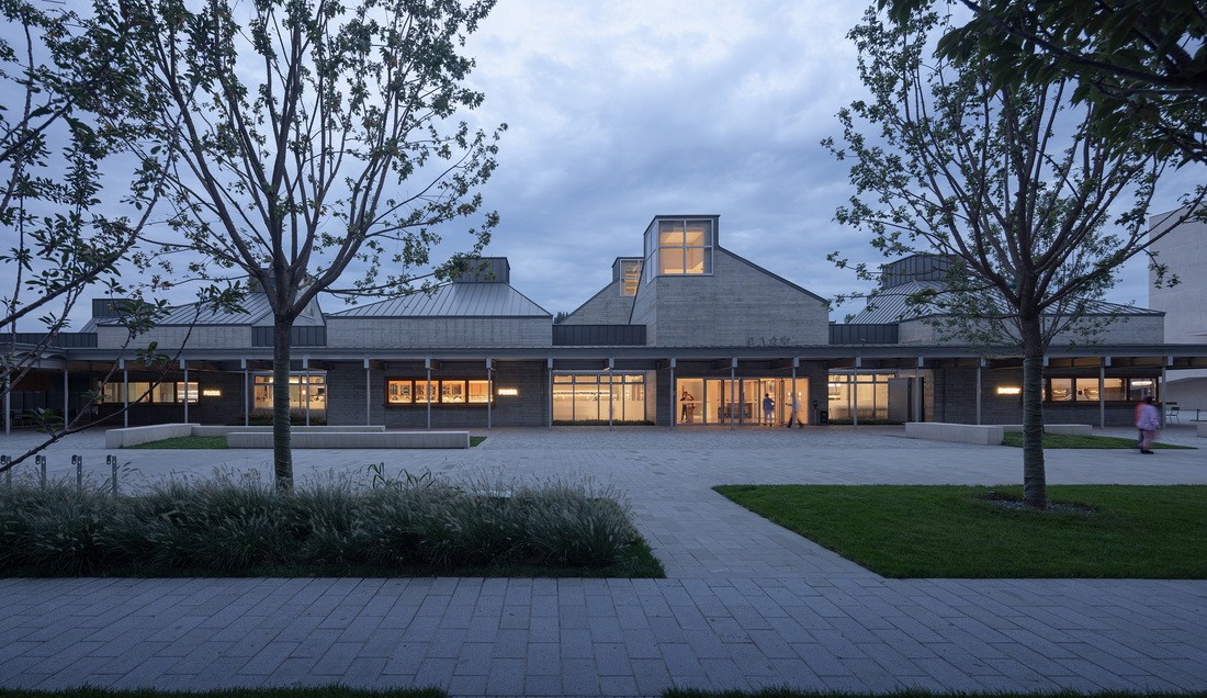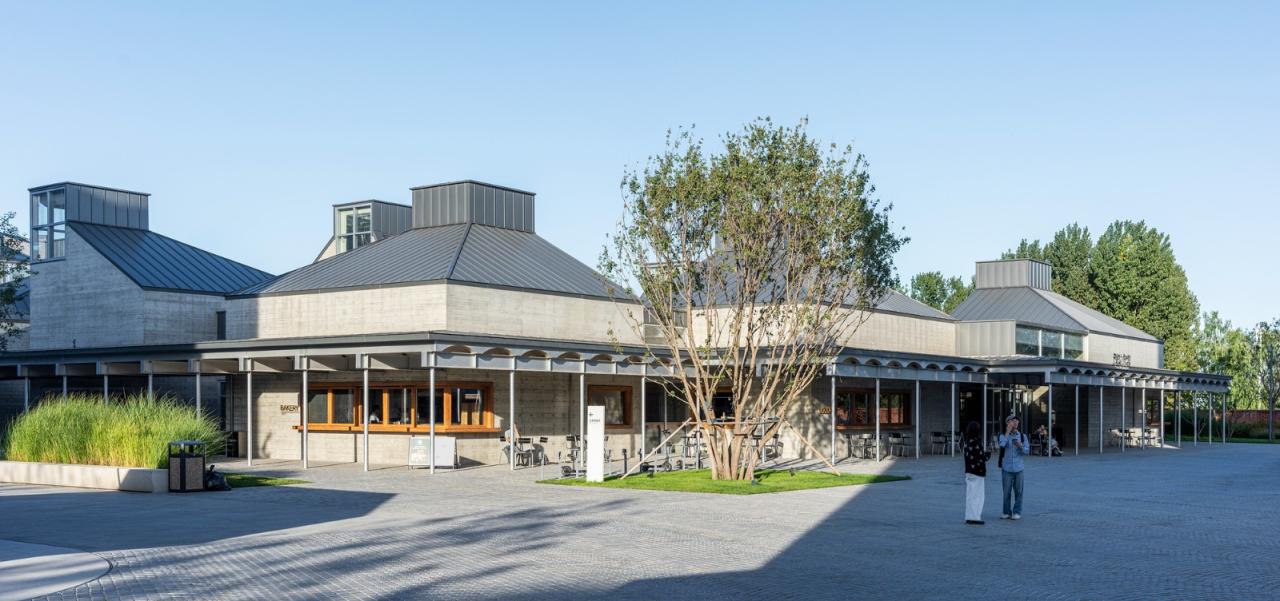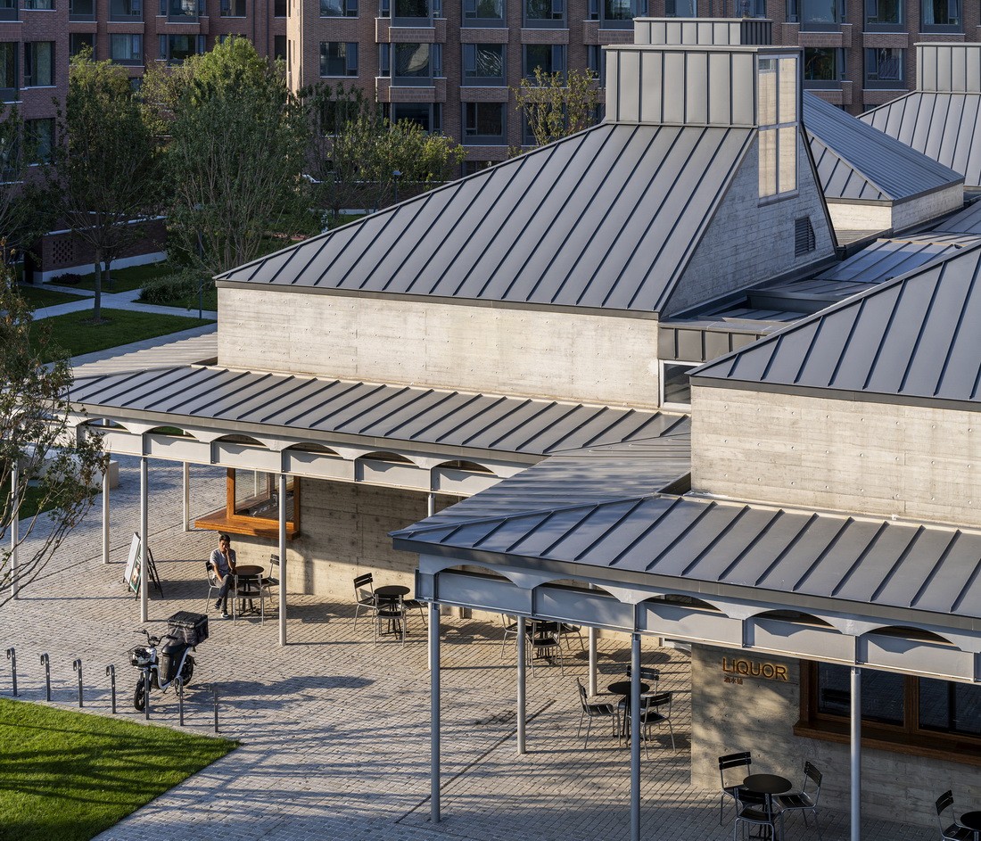 市集最外围是一圈屋顶压得更低的连续檐廊作为市集与园区空间的过渡,店铺在檐廊内都设有外卖窗口,檐廊在东侧和西北角分别做了蜿蜒外扩,形成被回廊环绕的三处绿植天井庭院。檐廊既形成尺度亲切的连续友好界面,营造了四通八达的良好进入感,又是旺季外摆和周末集市的拓展空间。这一空间结构在维持传统市集拓扑关系的前提下,以迷你尺度融入园区环境,成为由错落小屋顶限定的类聚落空间。市集的货运、库房、后厨、员工更衣等后勤空间和顾客停车库都位于地下层,与北岸园区的大底盘地下室一体。