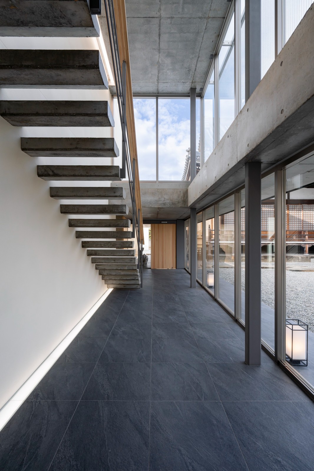 设计的一个显著特点是“寂静花园”,一个枯山水花园,以一棵松树和石头精心平衡的布局为特色。石头来自寺庙内部,加深了花园与场地传统的联系,而精心挑选的日本白松与地点完美地融合在一起。访客被邀请在半开放的空间舒适的躺椅上放松身心,眺望花园,沉浸在宁静的氛围中,怀念逝去的亲人。白色的石膏墙和广泛使用的木材在室内设计中占据重要地位,佛坛的颜色选择了深红色,而不是标准的黑色,唤起了西方净土的光芒和夕阳的色彩。