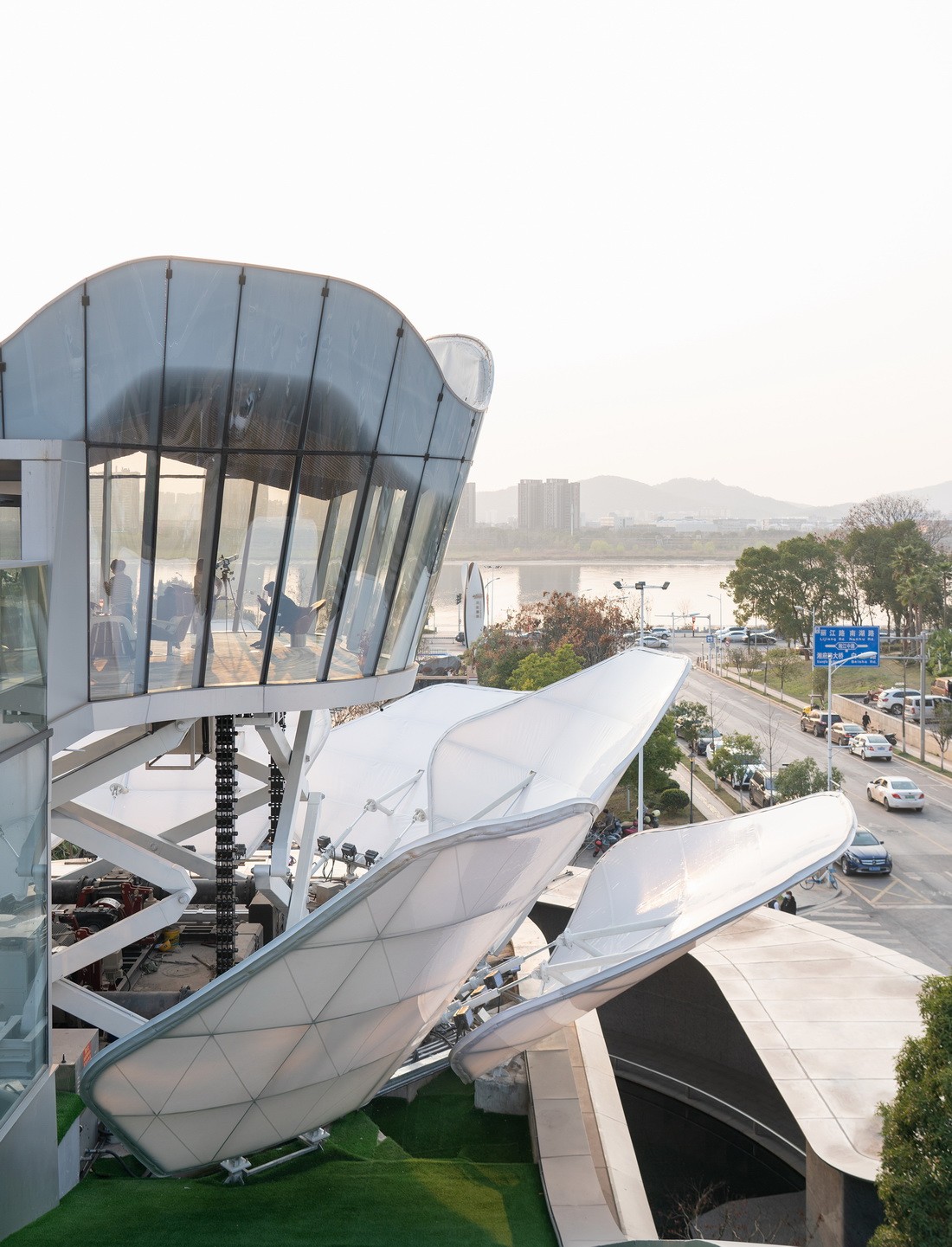 在“开放展示”与“收拢闭合”两个动态指令下——观光厅从廊道向上抬升至屋面层,可开合表皮向外展开,室内形成直面湘江的通透观景视野;反之,可开合表皮随观光厅的下降而收拢形成私密空间。整体形如花朵绽放的动态过程,“湘江之眼”的空间形式也由此初具雏形。