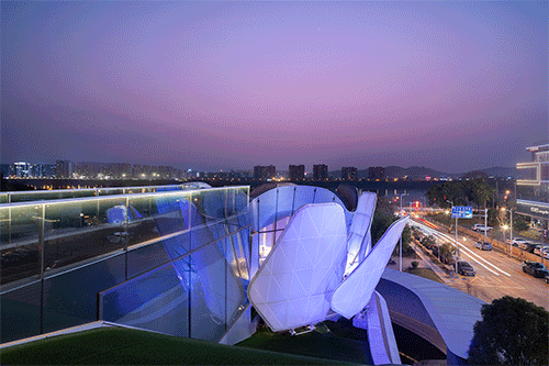 中心主体观光厅在倒圆台的基础形上演化而来,回应花蕊簇拥下的生动空间效果,通体环绕双曲面玻璃。