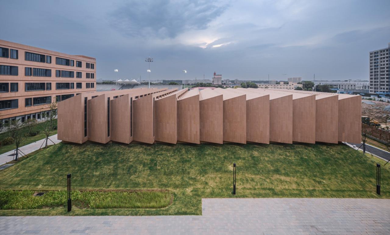 通过外立面木纹效果的反复试验,形成了梅村高级中学空港分校呈现出的整体木纹效果。低造价高品质材料的选择,营造了一个低碳高效的未来校园。在融合地域风貌的同时,通过采用环保、可重复利用的材料,力求将低碳践行其中。同时,校园设计结合架空、立面开洞、遮阳、海绵设计等绿色技术的处理,打造了一个空间舒适且低能耗、高效率的校园建筑空间群体,将低碳校园的理念贯穿于校园设计全过程。
