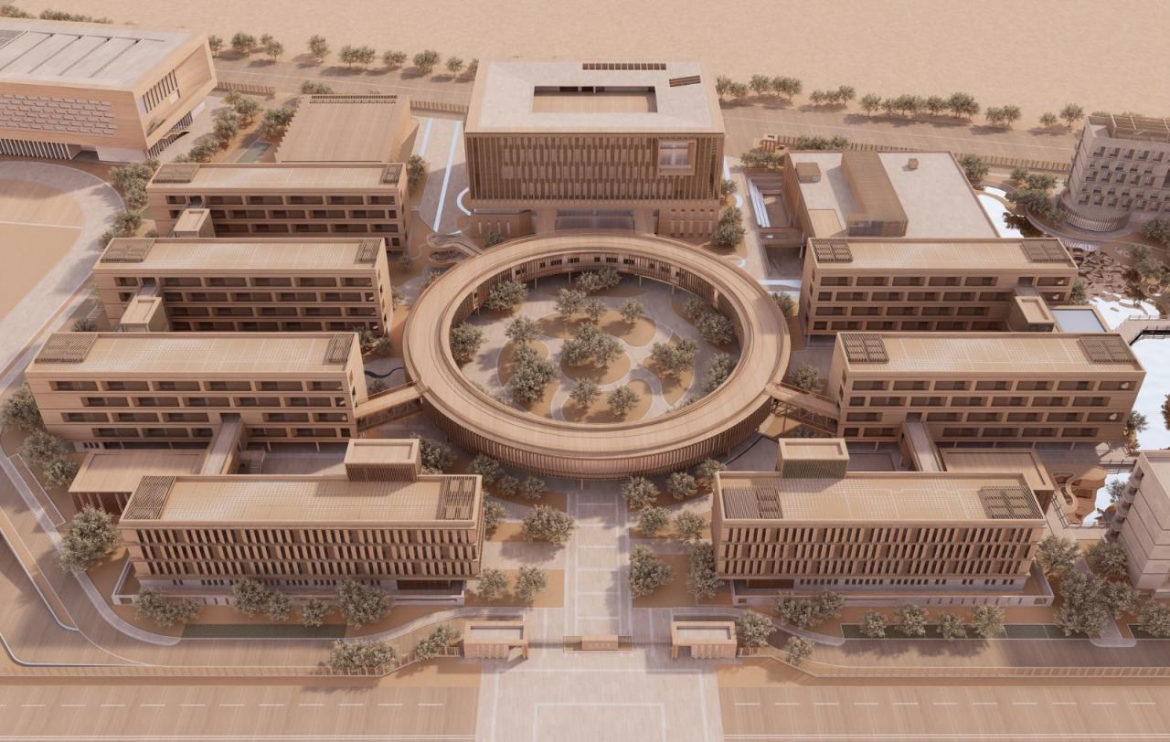 打造一个真正意义上的花园式的绿洲新校园,是设计团队在此次项目设计过程中一直在探索和追求的目标。校园以中心直径85m的“学术圆环”作为文化传承的最核心载体,以多层级的共享交流空间作为学校公共性的体现。圆环中部的“梅苑”、顶部的生态花园跑道,将校园的绿化空间由地面延伸至第五立面,通过不同层次的绿化种植,营造校园的“绿洲”氛围。