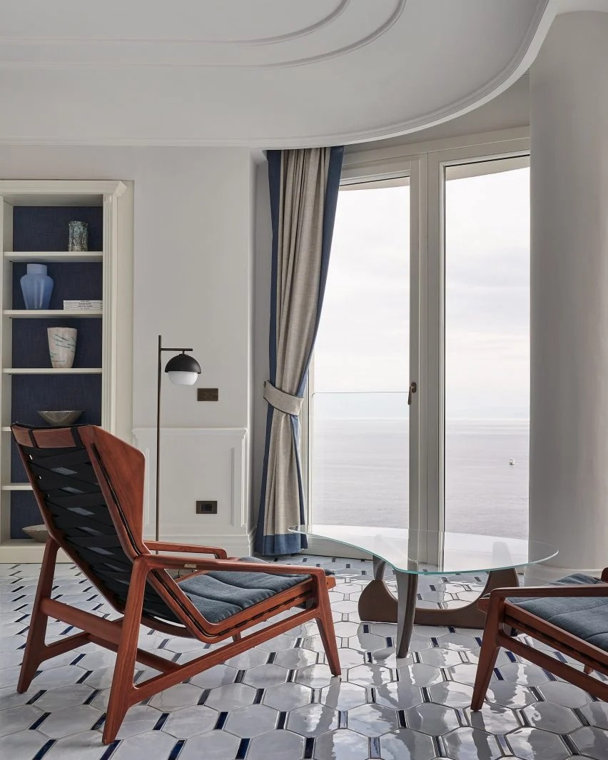 其中一些客房建在古老的石头城墙里,高大的拱形窗户和门勾勒出海洋的景色。许多房间都有蓝色和白色的瓷砖地板,与浴室相匹配,并决定了家具和床上用品的配色方案。根据酒店设计团队的说法,目的是“创造一个独特的环境,将中世纪的设计与地中海风格相结合”。早餐是在自然采光的阿利西(Alici)的拱形天花板下供应的,或在其广阔的毗邻露台上。另一个用餐选择是马里内拉餐厅(Marinella Restaurant),提供使用当地农产品制作的地区美食,以保留烹饪传统,还提供露天座位。一个名为“拉利布里亚”(La Libreria)的空间充满了深色的木制书柜,在白天充当图书馆,在夏季高峰期间用于私人活动。