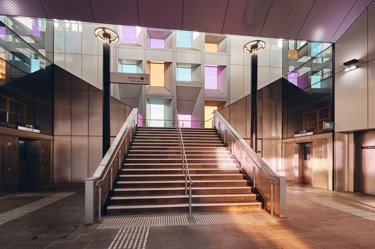 在整个项目中,色彩和形式被用作营造场所的工具。梅尔达线被赋予了淡紫色的标识。因此,粉红色和淡紫色的支柱和特色照明被用作市政标志。作为建筑环境中不自然出现的颜色,这些标识物增强了车站的显著性。两个车站立面的图案、有色覆盖元素和照明使建筑物能够成为营造场所的机制,并将铁路作为公共建筑的一部分来庆祝。两个车站的设计都提倡环境意识,体现在车站的可持续性认证中,包括符合铁路项目的最高ISC和6星绿色建筑要求。