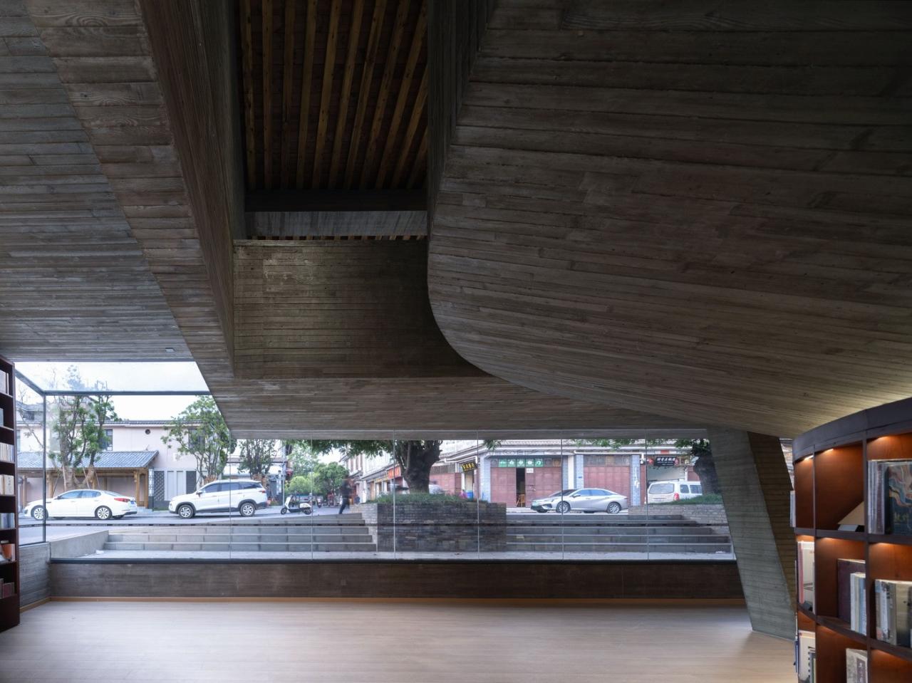 平面上,一条对角线将书廊分为内外两个部分——内侧空间维度逐渐横向收缩,最终凝聚成远方的一个视觉焦点,非平行布局加强了内部空间的透视和纵深感,犹如行走在图书的“精神隧道”,与周边古建形成了截然不同的空间体验。