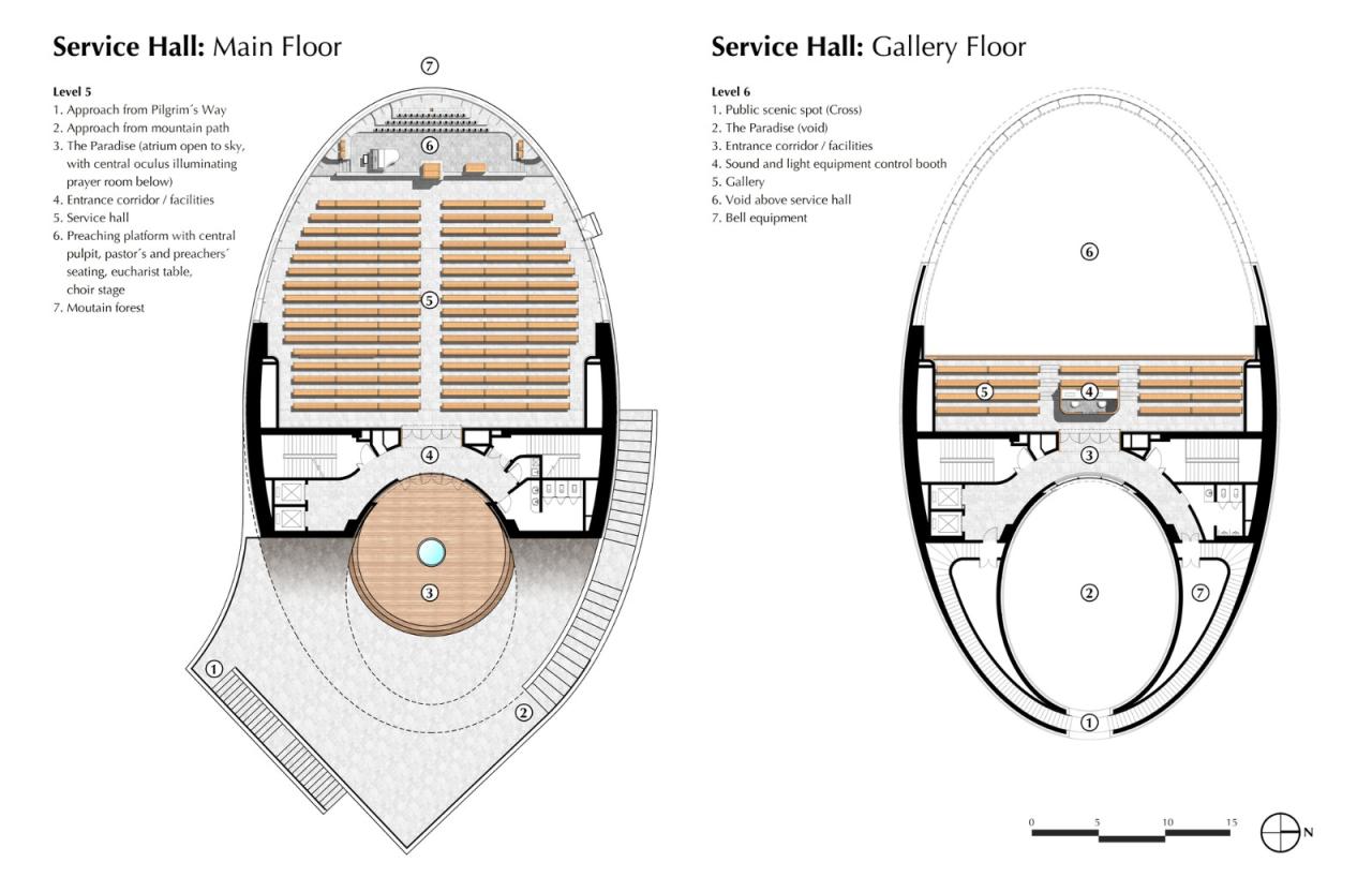 功能性+标志性。教堂是一只方舟 – 漂浮在世界上,根植于信仰的基石 – 这是一个古老的理念。受到这种形象的启发,我们的解决方案包括两部分:下部覆盖着花岗岩,类似于梯田状的岩石。它能够灵活划分,满足世俗需求。顶部是教堂中殿,装饰着GRC板,唤起了一个抽象的方舟。其形式避免了文字表意,给予了叙事的微妙表现。